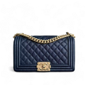 The Chanel Boy Medium in 25CM Caviar Quilted Dark Navy Blue with Gold Hardware is a timeless piece that exudes elegance and sophistication. Crafted from durable caviar leather, its rich navy hue pairs beautifully with the luxurious gold hardware, making it a standout accessory. This particular color combination is a rare find, adding an exclusive touch to any collection. Perfect for both day and night, this bag effortlessly elevates any outfit.