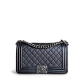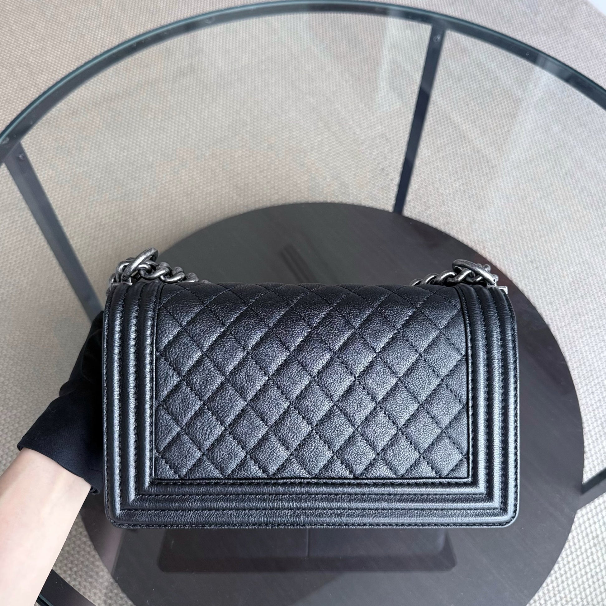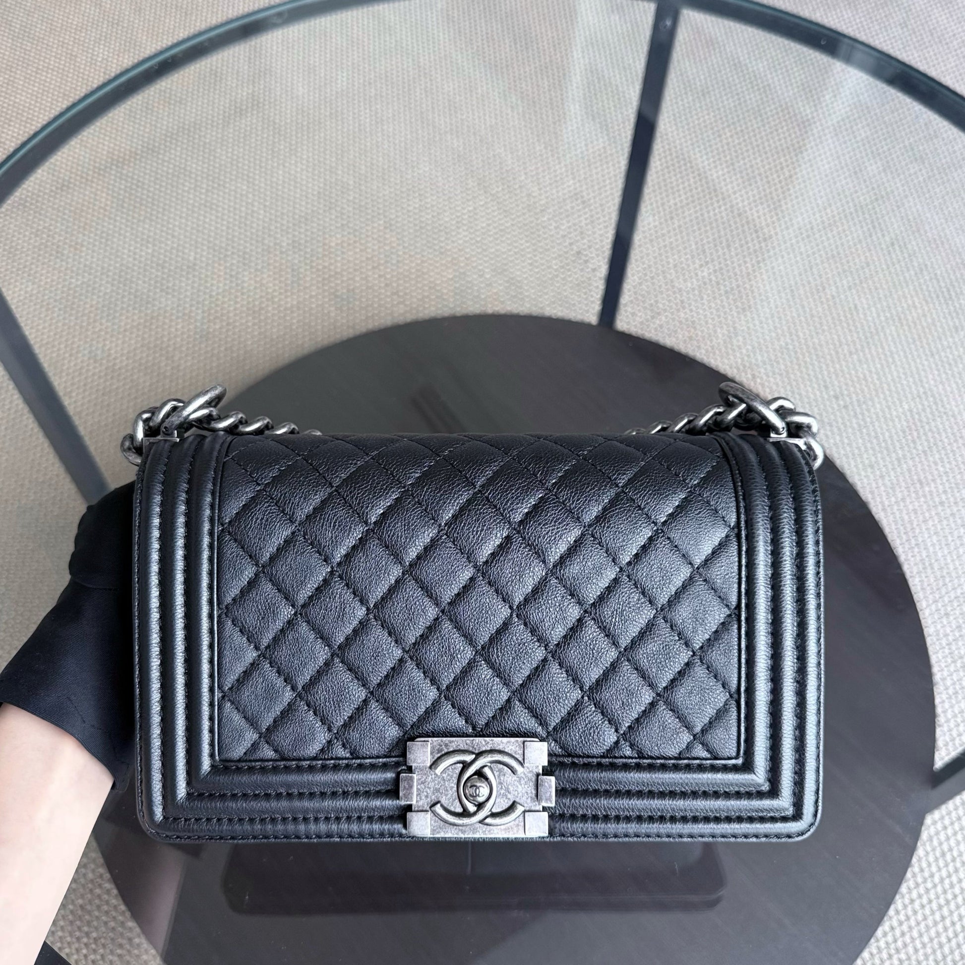 Chanel Boy Medium - 25CM Quilted Grained Aged Calfskin Black Ruthenium Silver Hardware Series 18