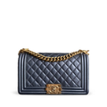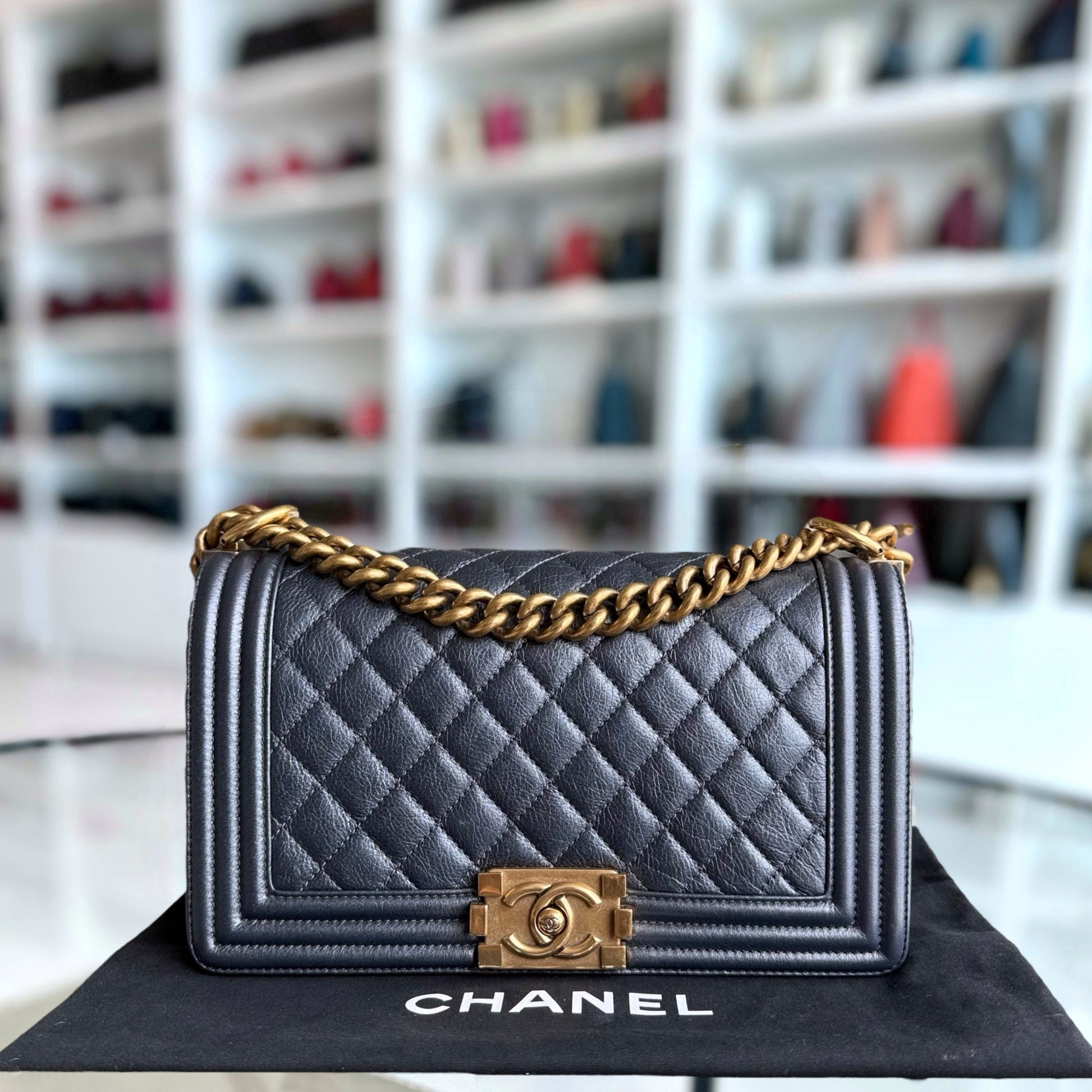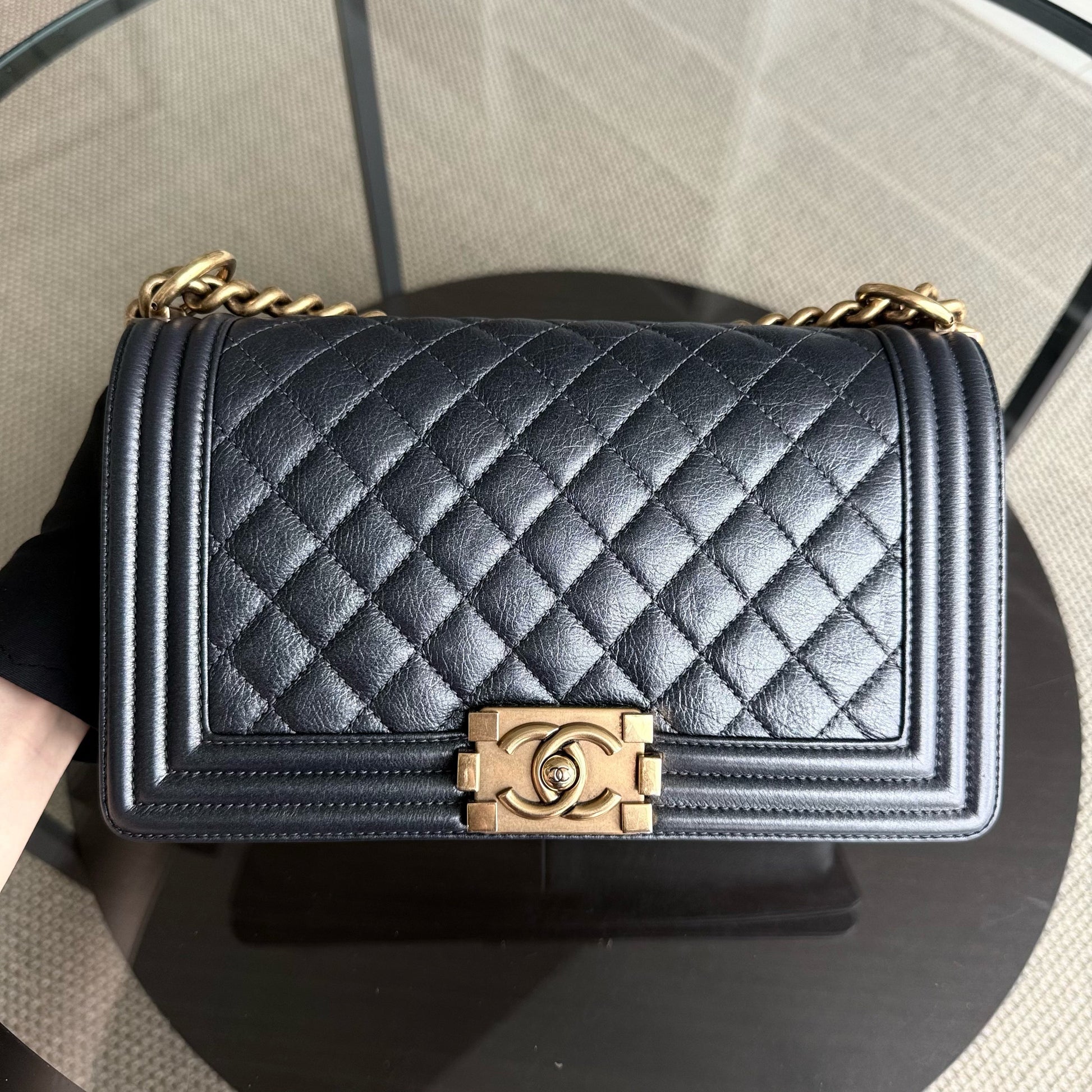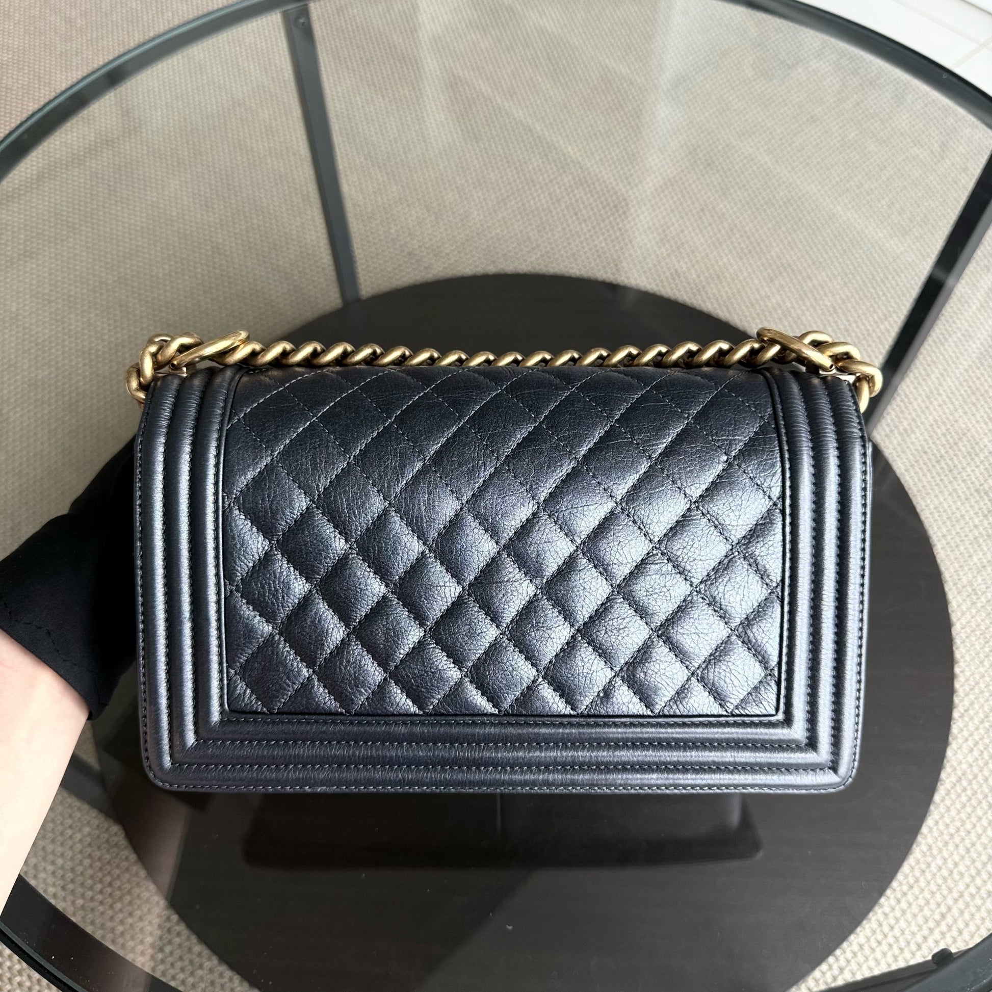 Chanel Boy Medium - Calfskin 25CM Quilted Iridescent Charcoal Black Aged Gold Hardware Series 20