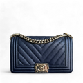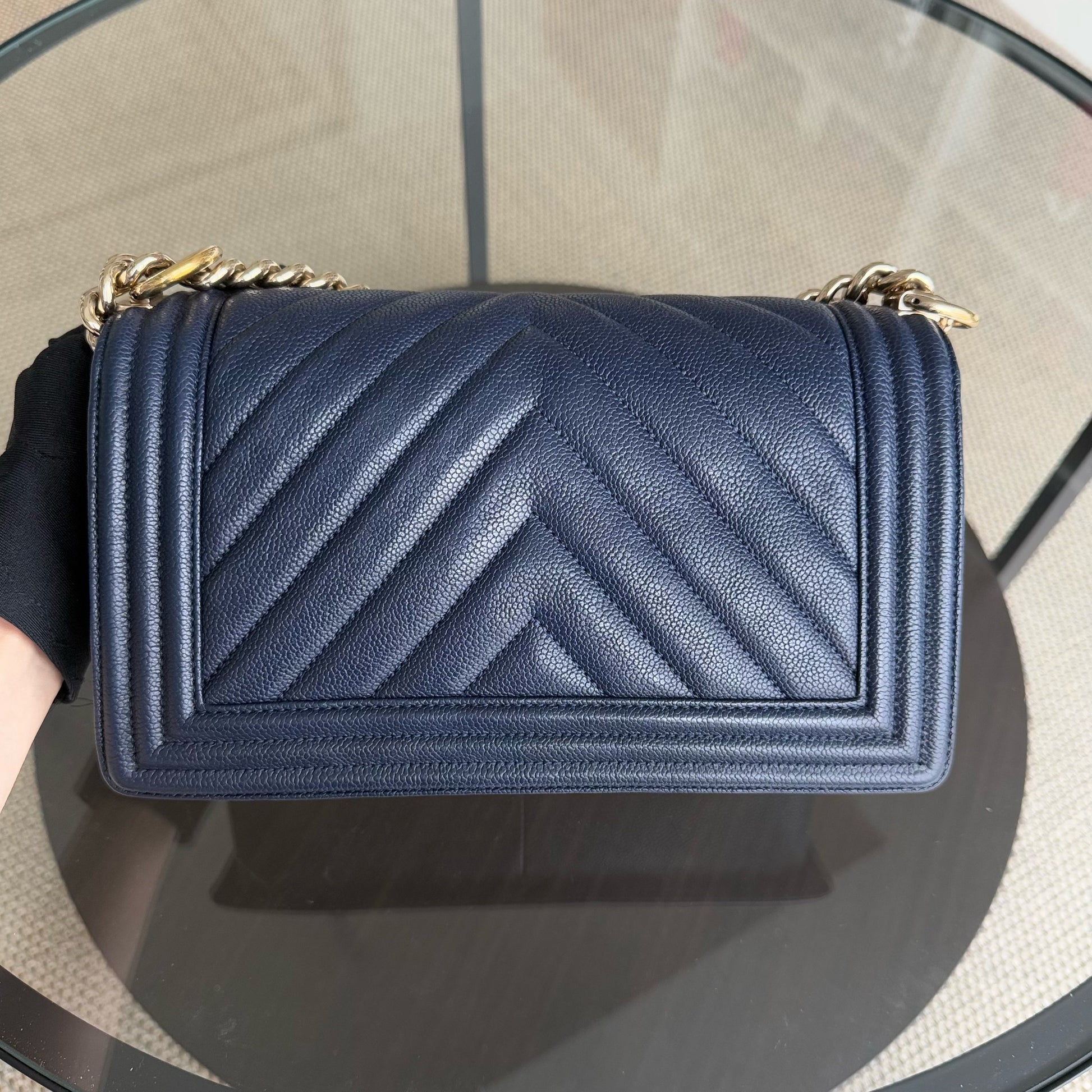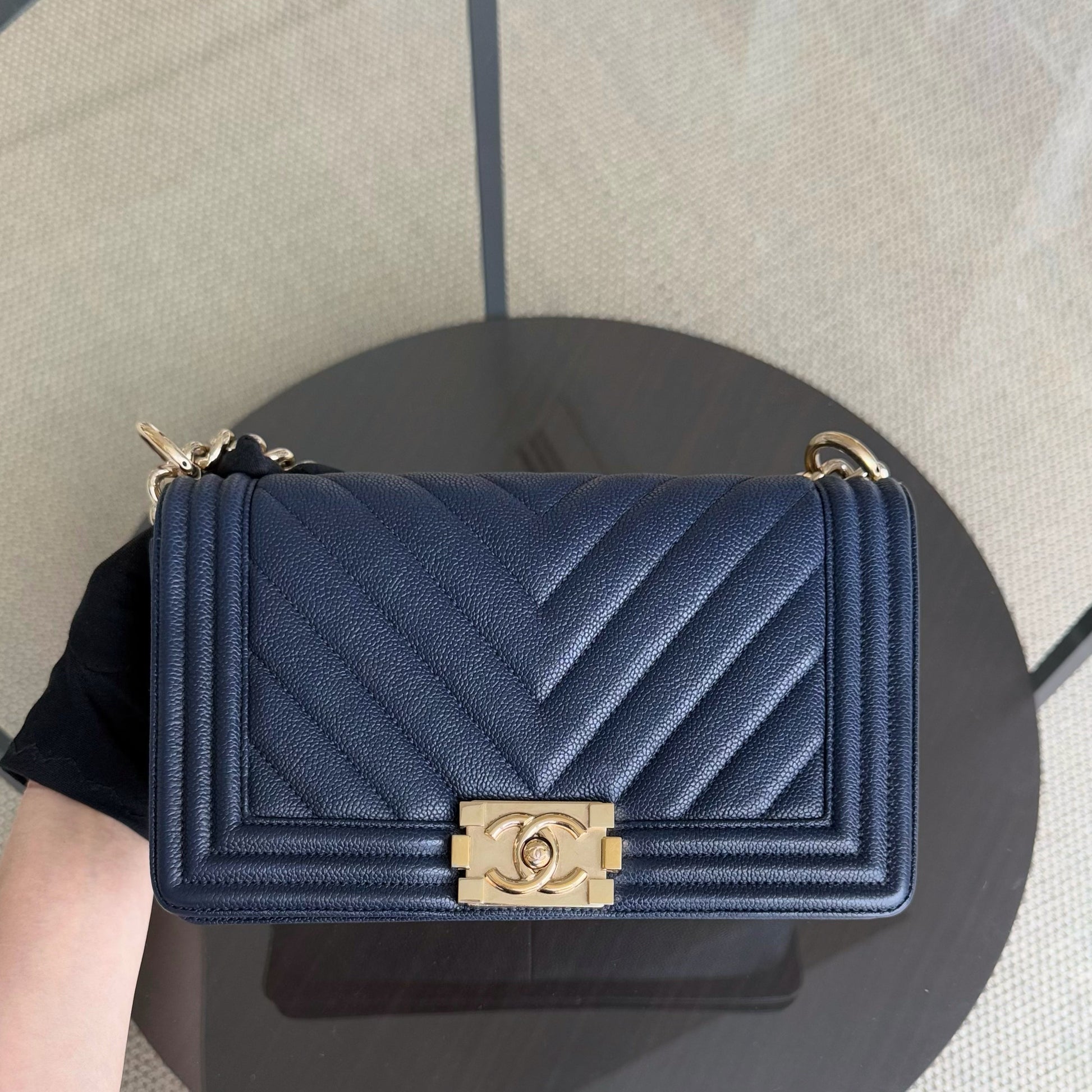 Chanel Boy Medium - Caviar 25CM Chevron Dark Navy Blue Gold Hardware Series 24