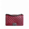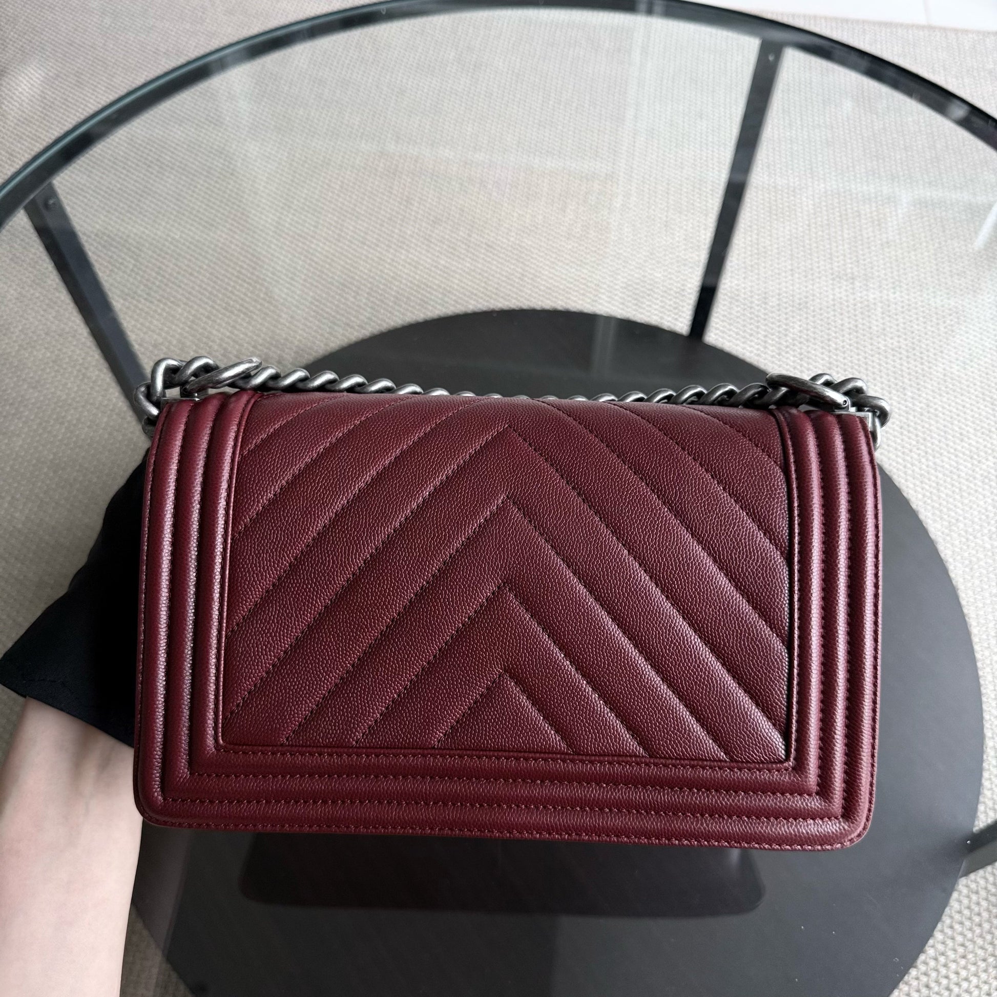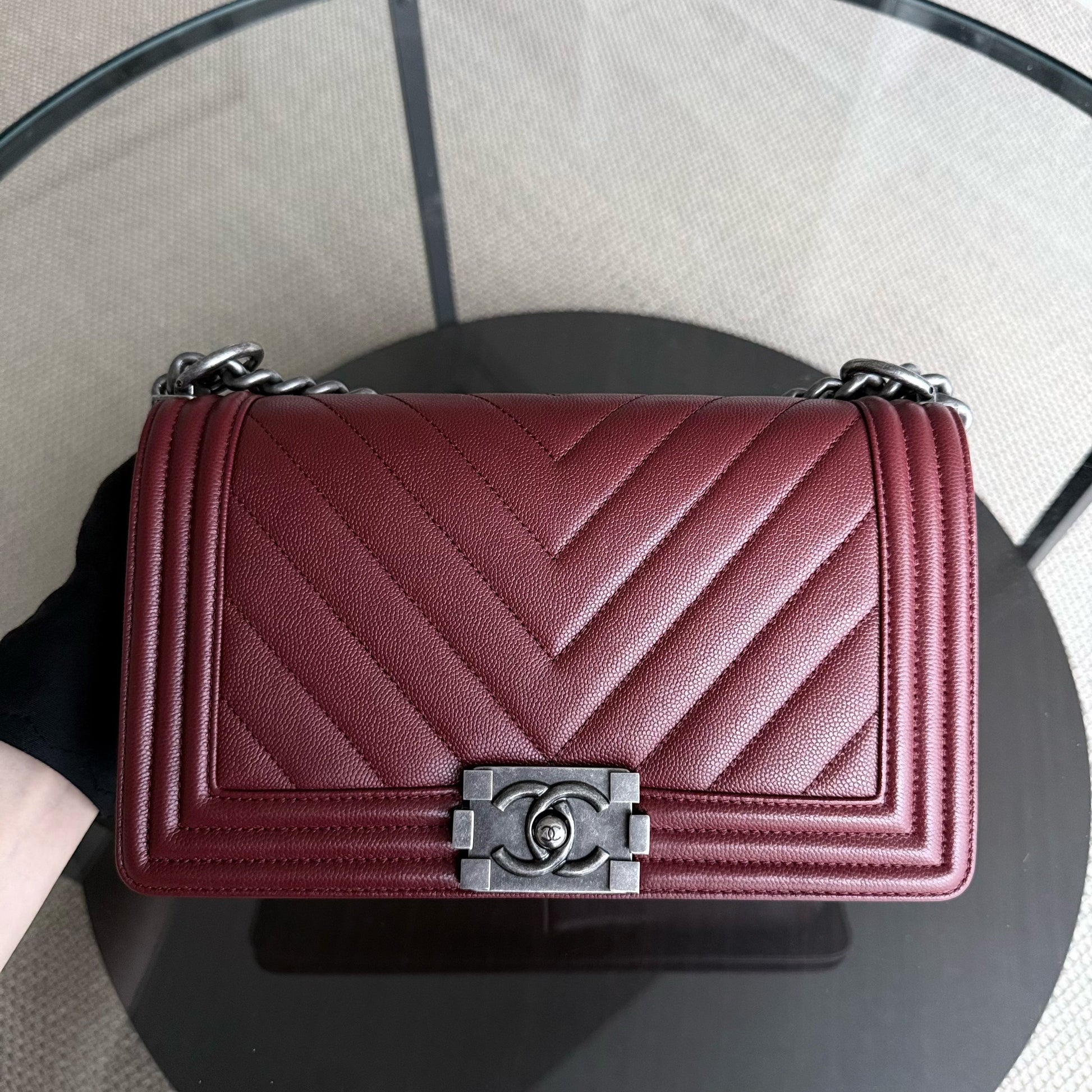 Chanel Boy Medium - Caviar 25CM Chevron Dark Red Burgundy Ruthenium Silver Hardware Series 24