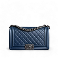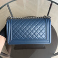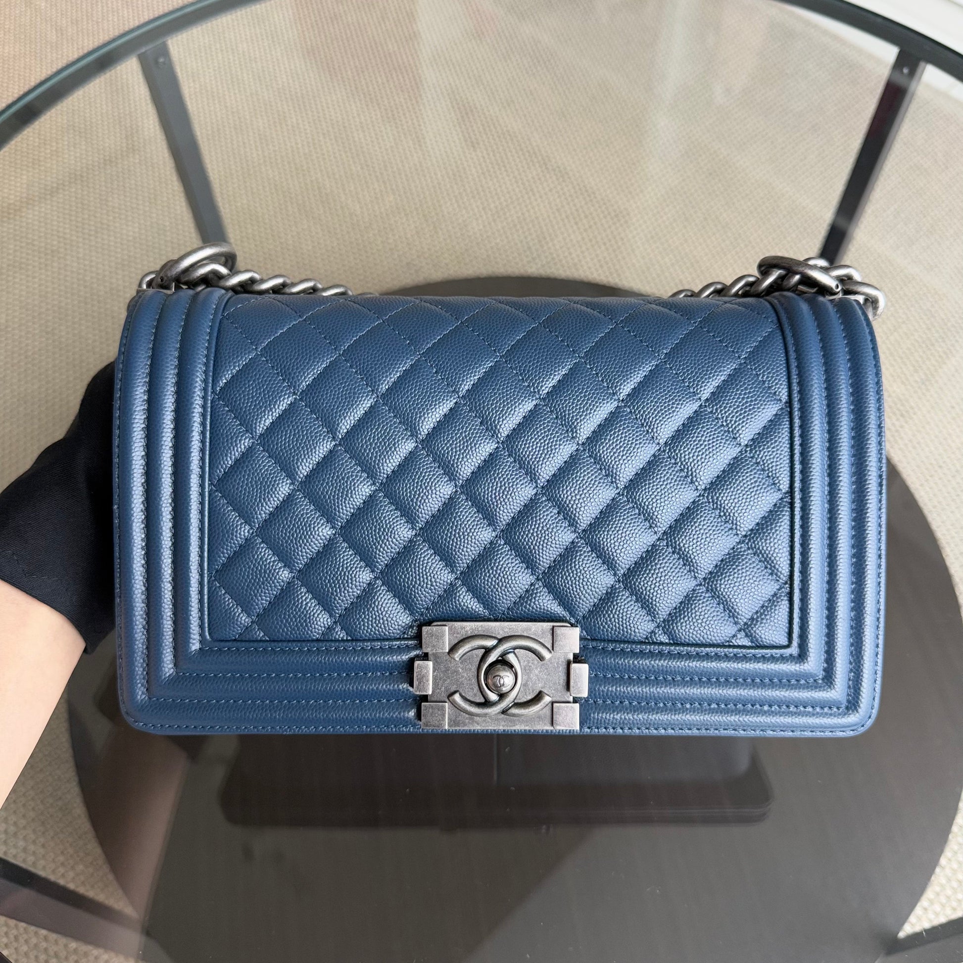 Chanel Boy Medium - Caviar 25CM Quilted Dark Navy Blue Ruthenium Silver Hardware Series 25