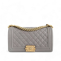 A timeless piece, the Chanel Boy Medium in luxurious caviar leather exudes elegance with its quilted light grey finish and striking gold hardware. Perfectly sized at 25CM, it offers both style and functionality.