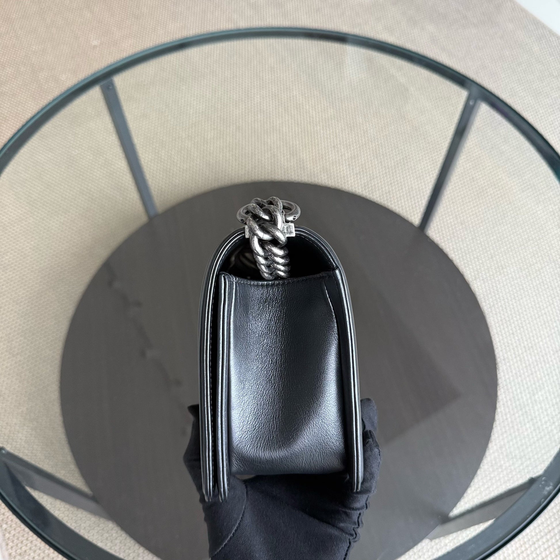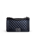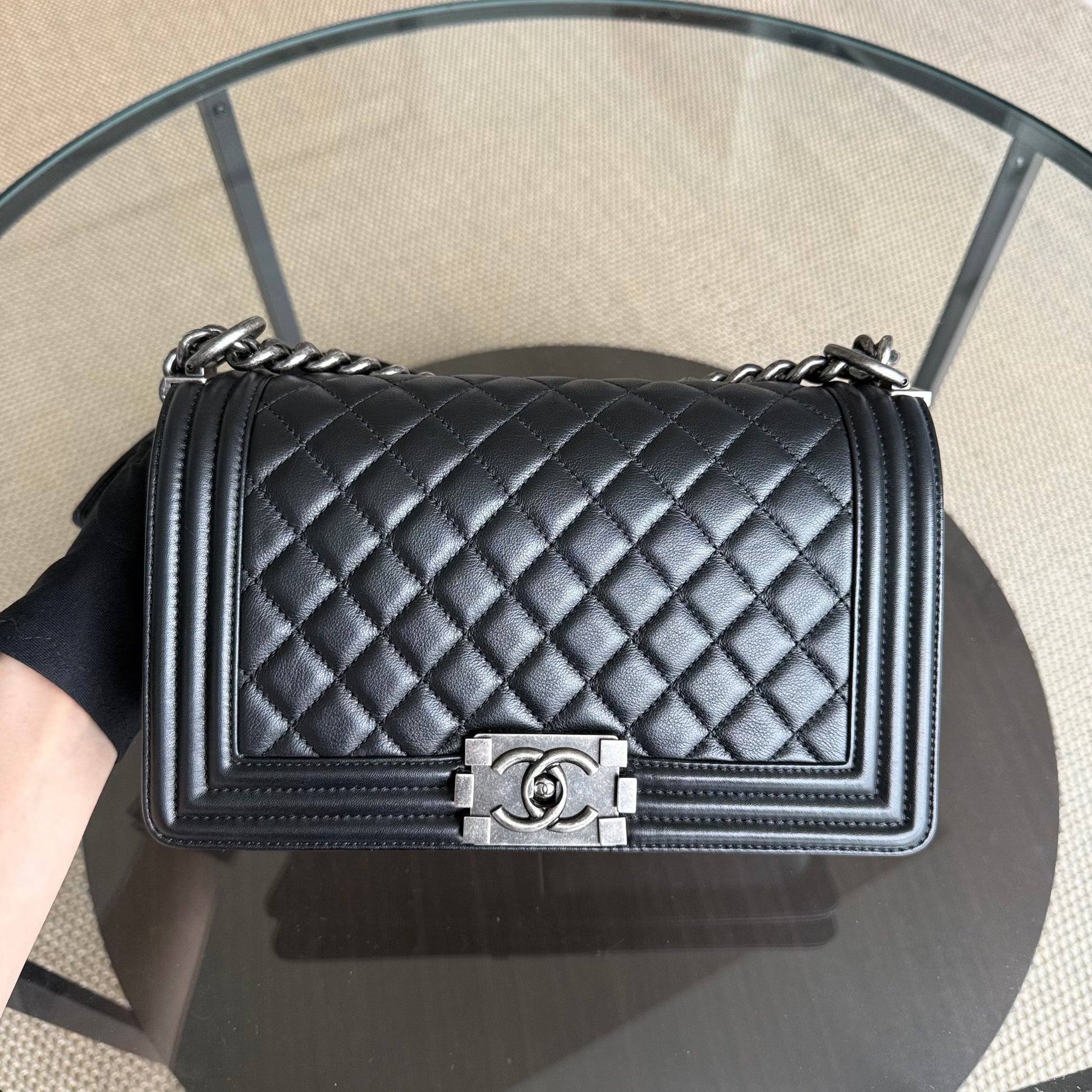 Chanel Boy Medium - Grained Calfskin 25CM Quilted Black Ruthenium Silver Hardware Series 24