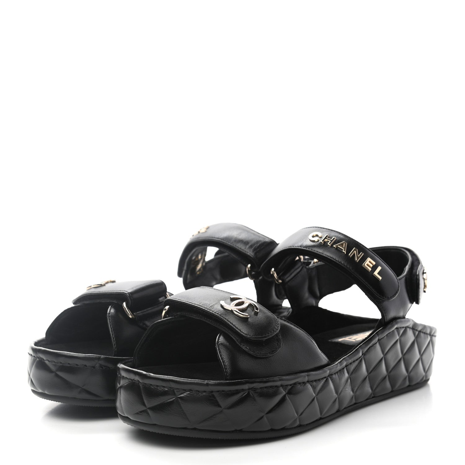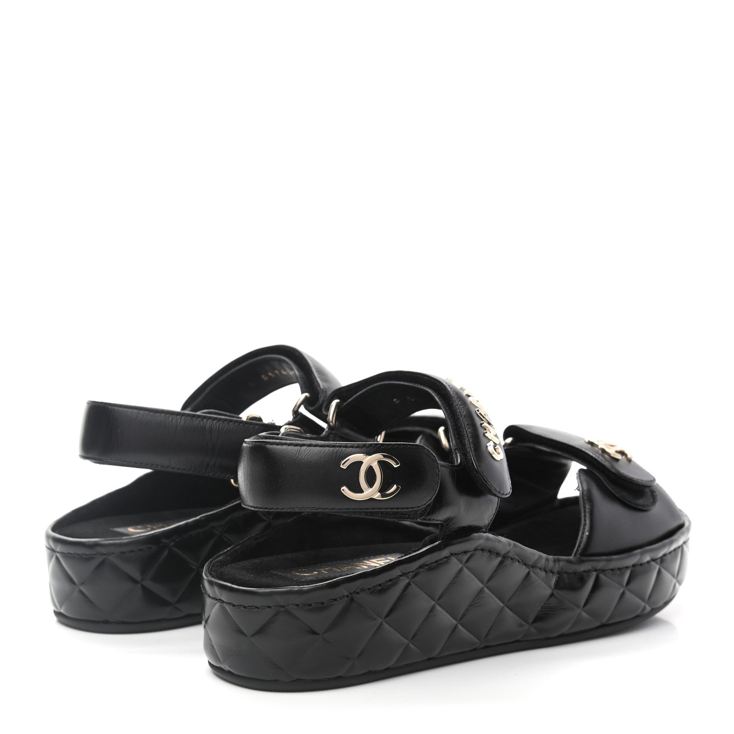 These sandals feature velcro ankle straps and gold CC and Chanel logos on the straps.