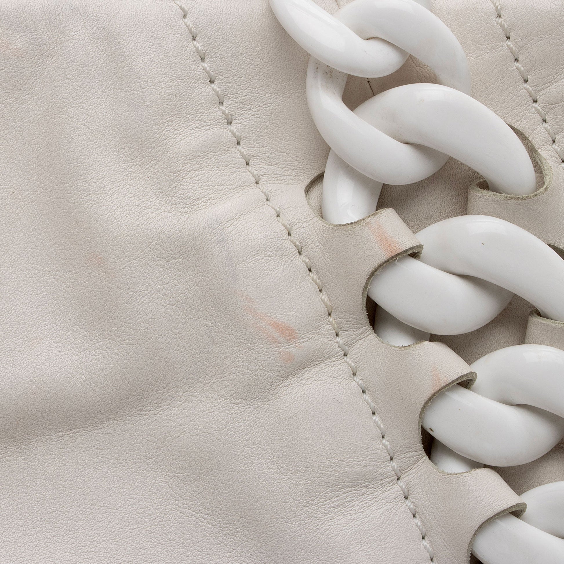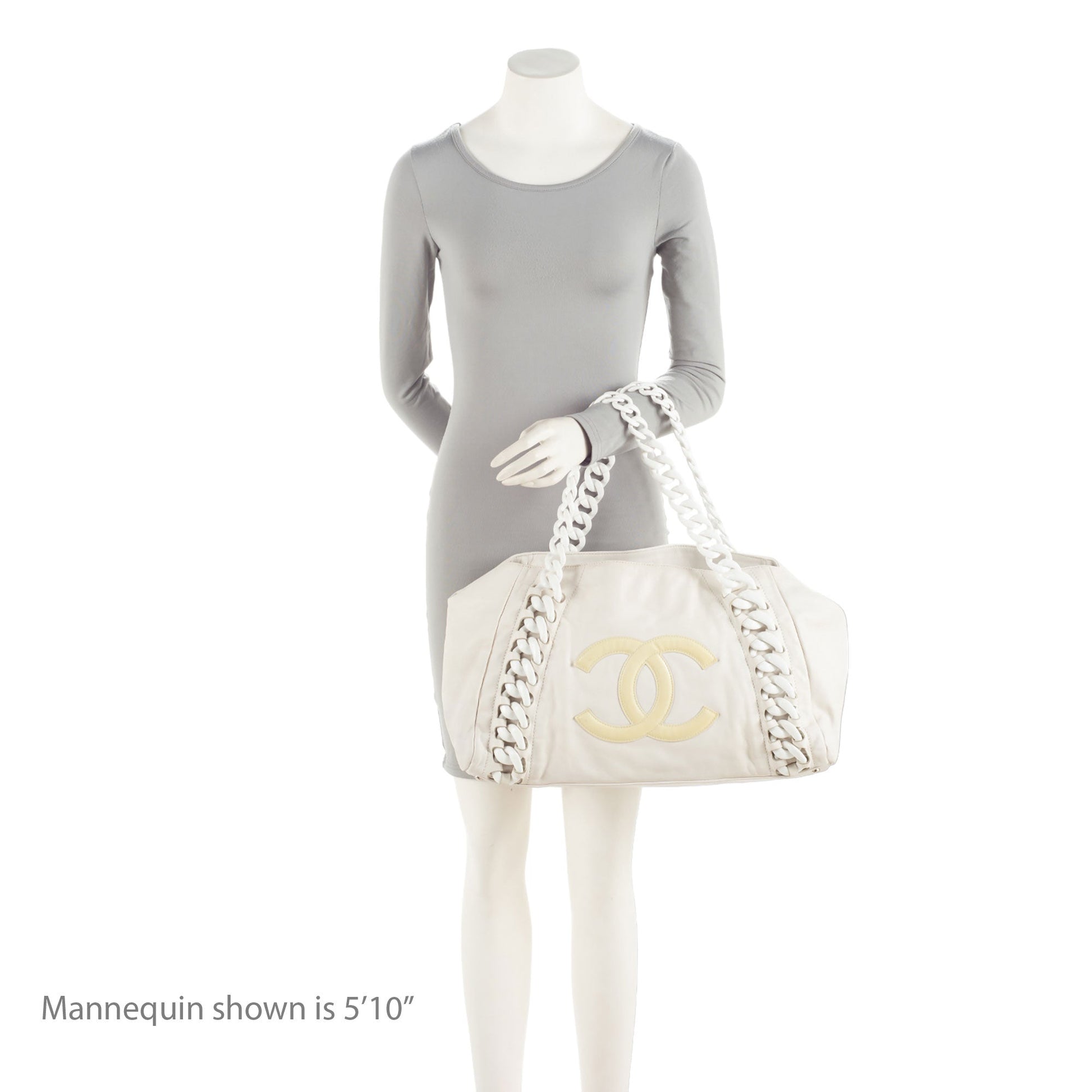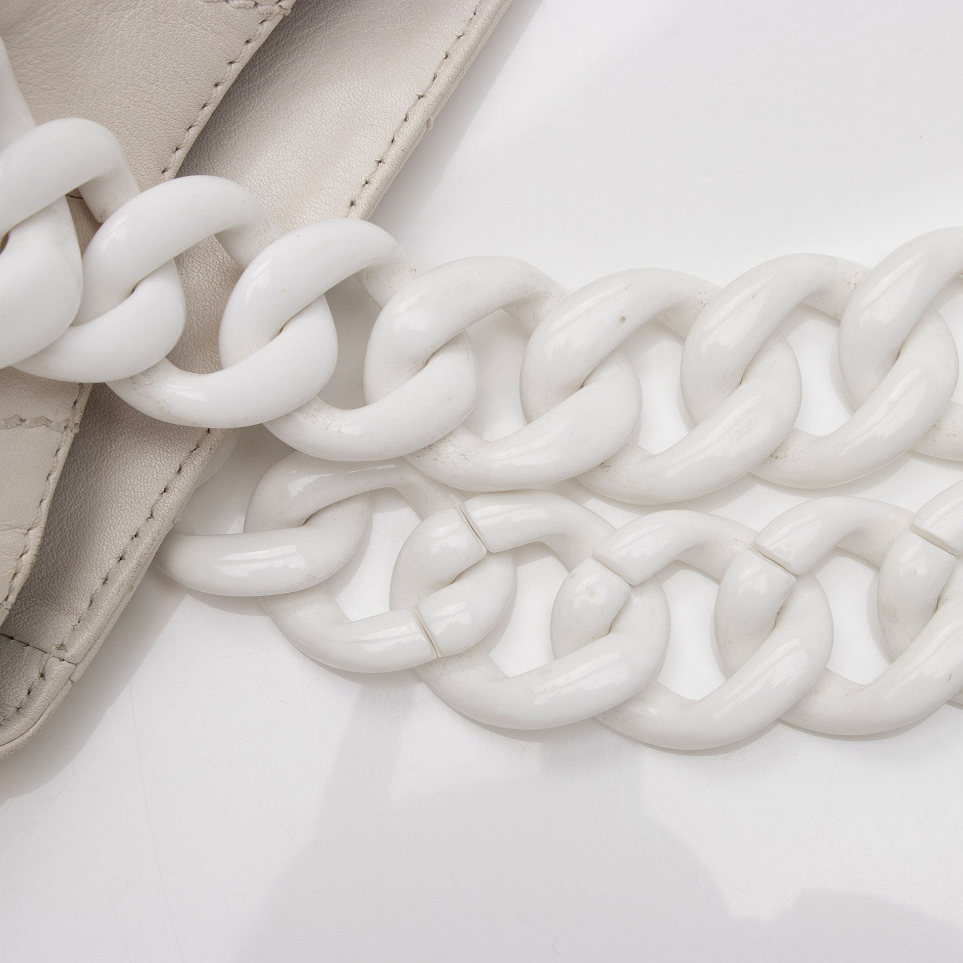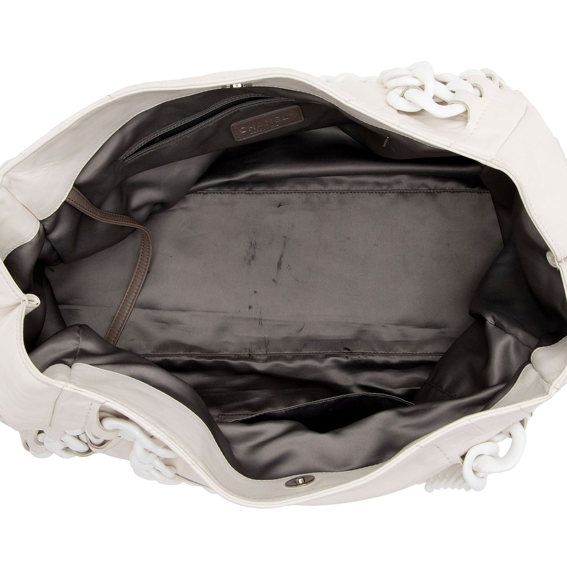 Condition Notes: Creasing, marks, and light darkening throughout exterior calfskin. Darkening and marks to exterior bottom corners. Marks and wear throughout front CC logo. Marks and surface scratches throughout exterior resin chains. Moderate marks and ink marks throughout interior.