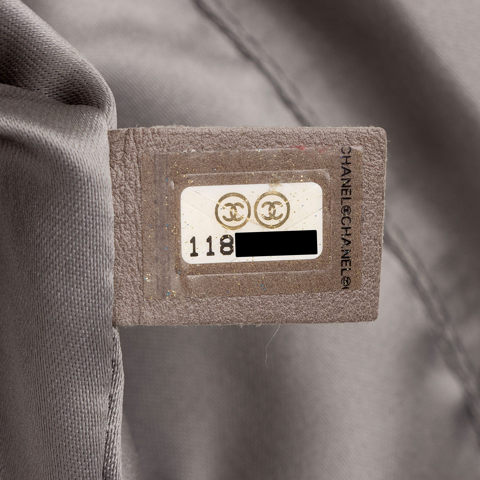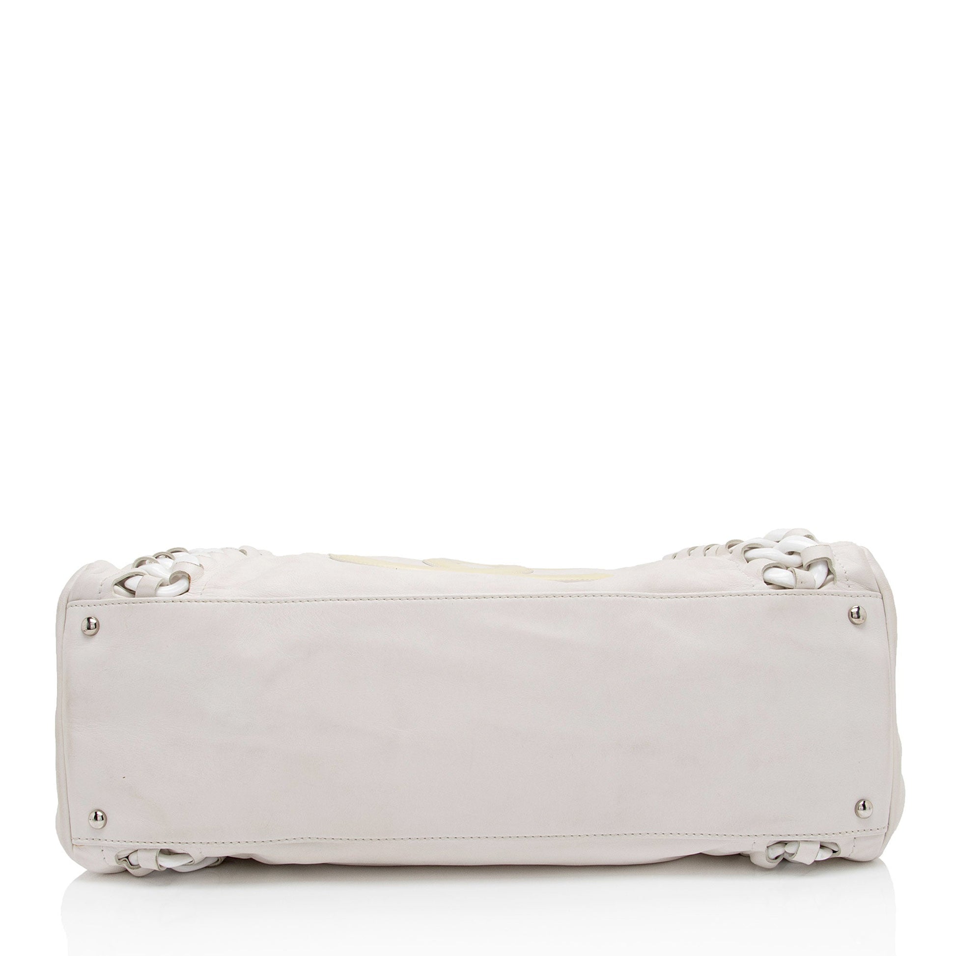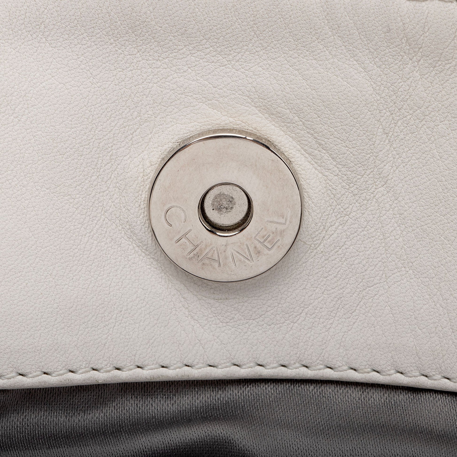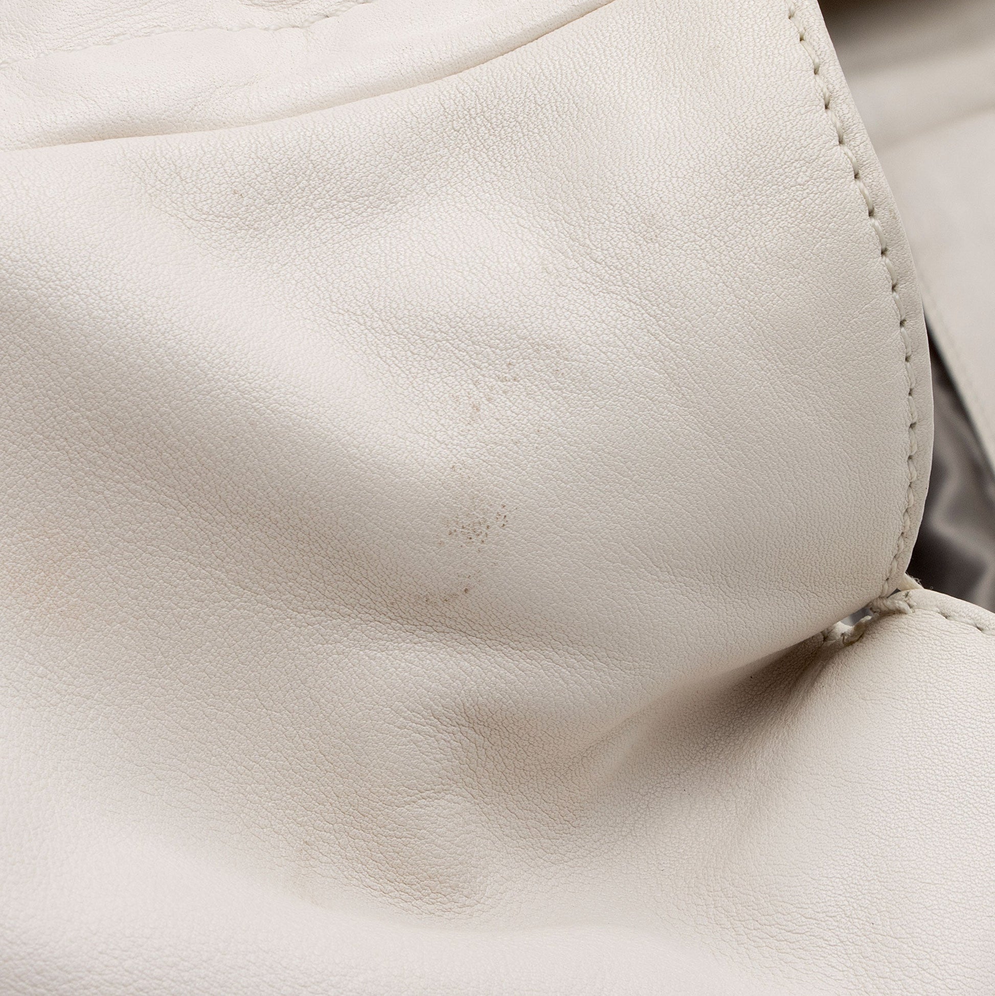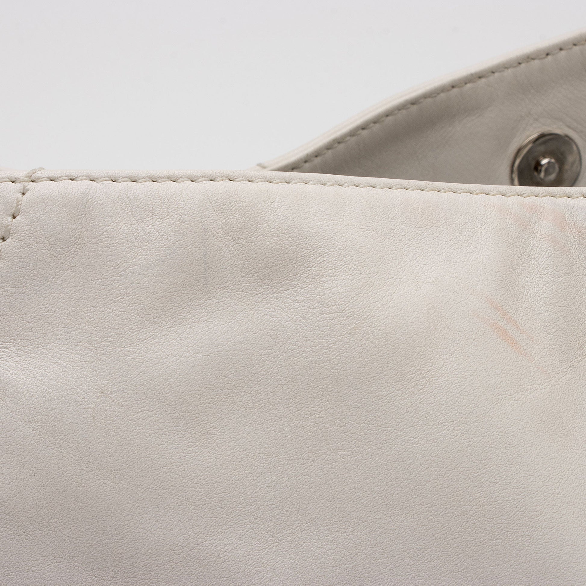 Condition Notes: Creasing, marks, and light darkening throughout exterior calfskin. Darkening and marks to exterior bottom corners. Marks and wear throughout front CC logo. Marks and surface scratches throughout exterior resin chains. Moderate marks and ink marks throughout interior.