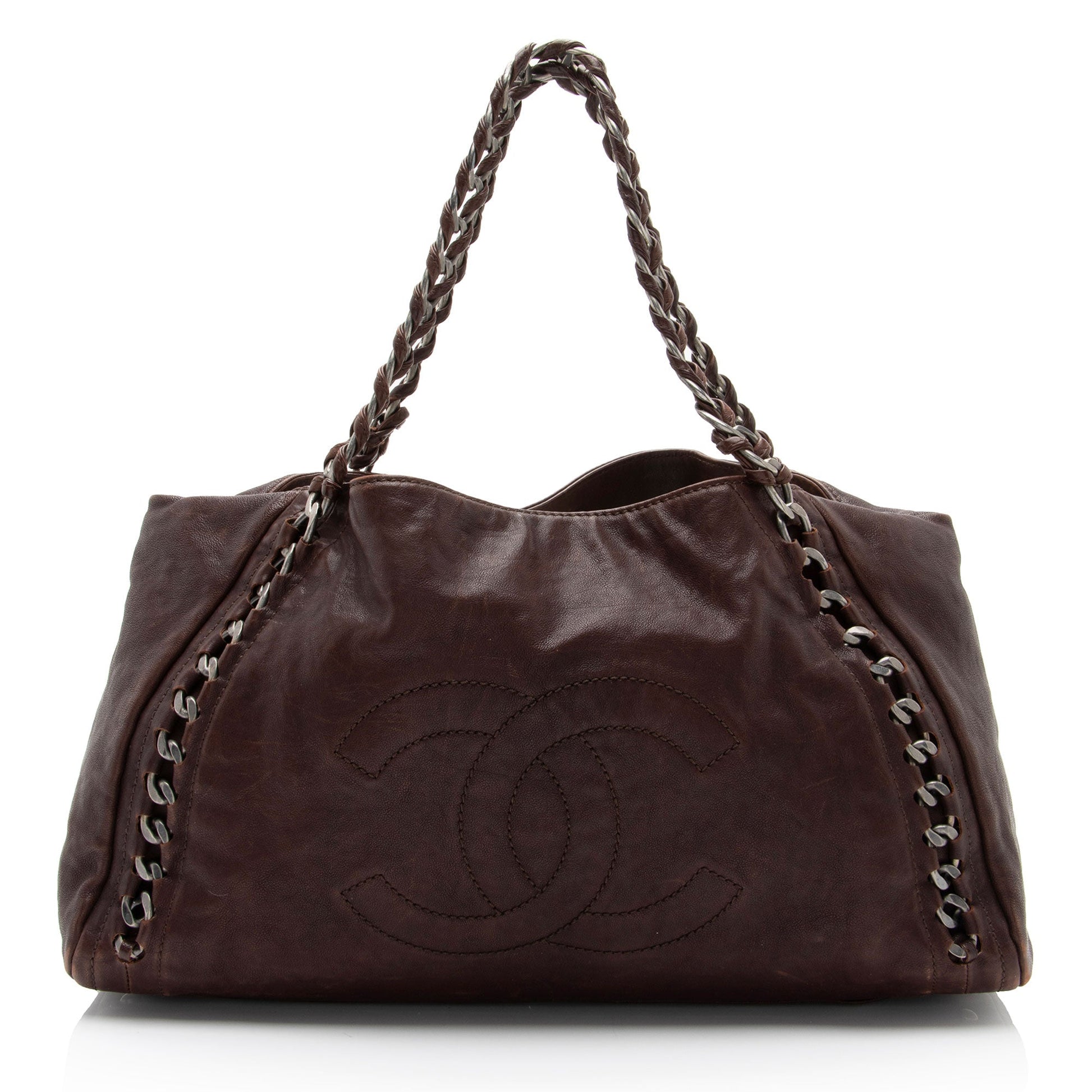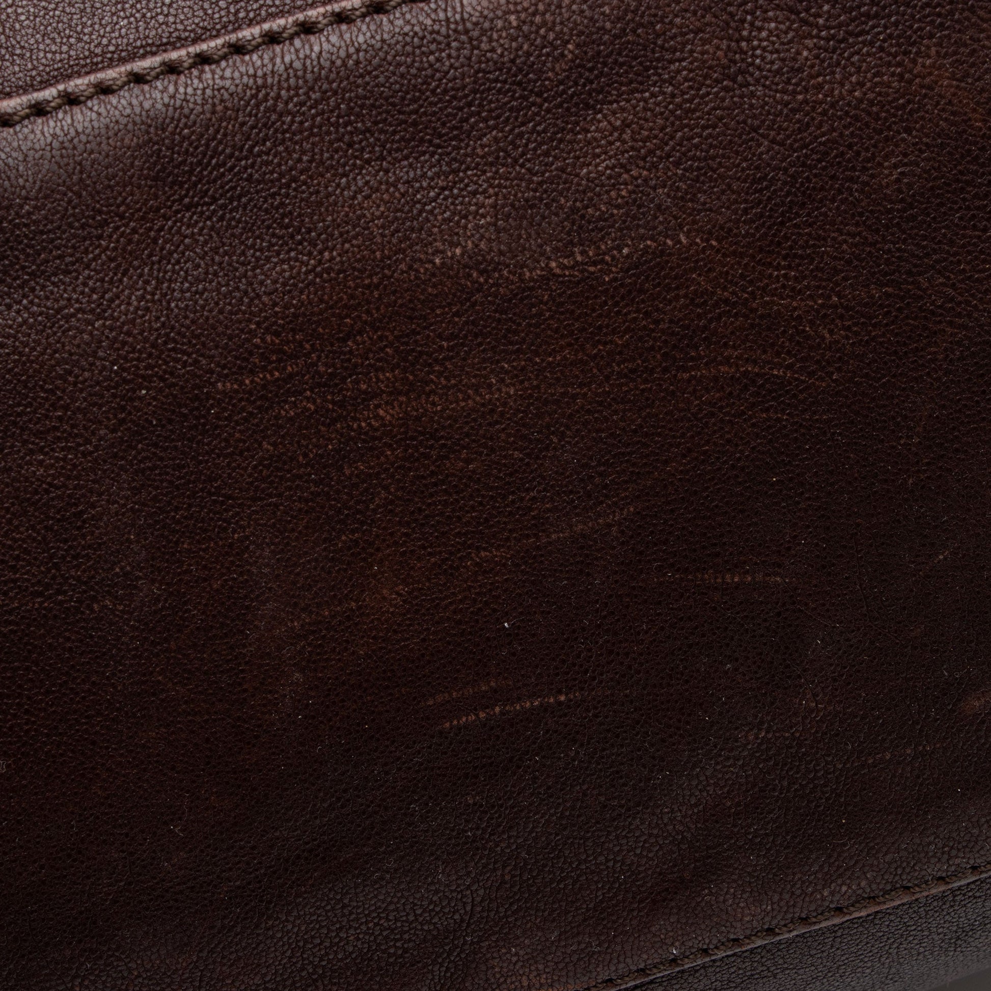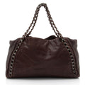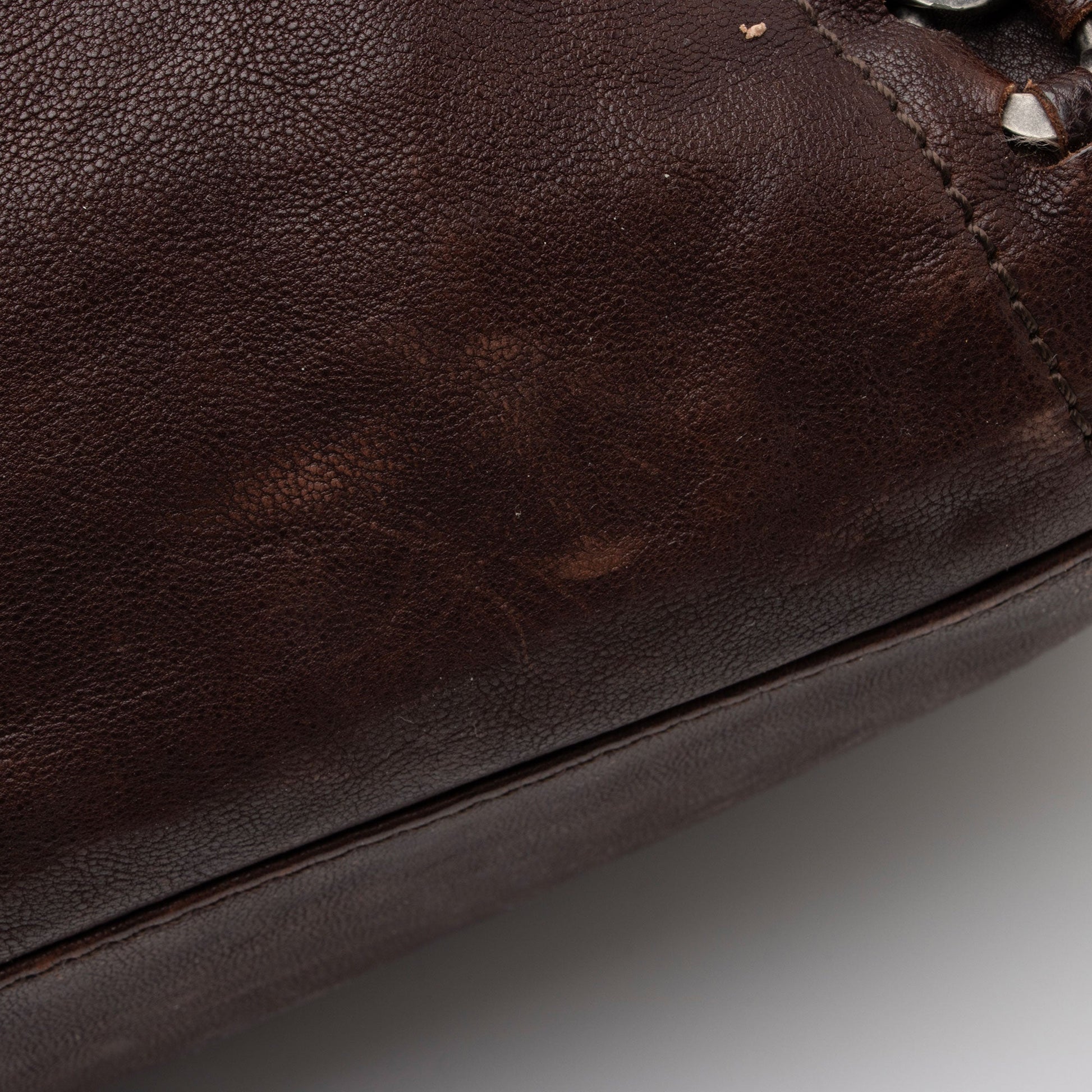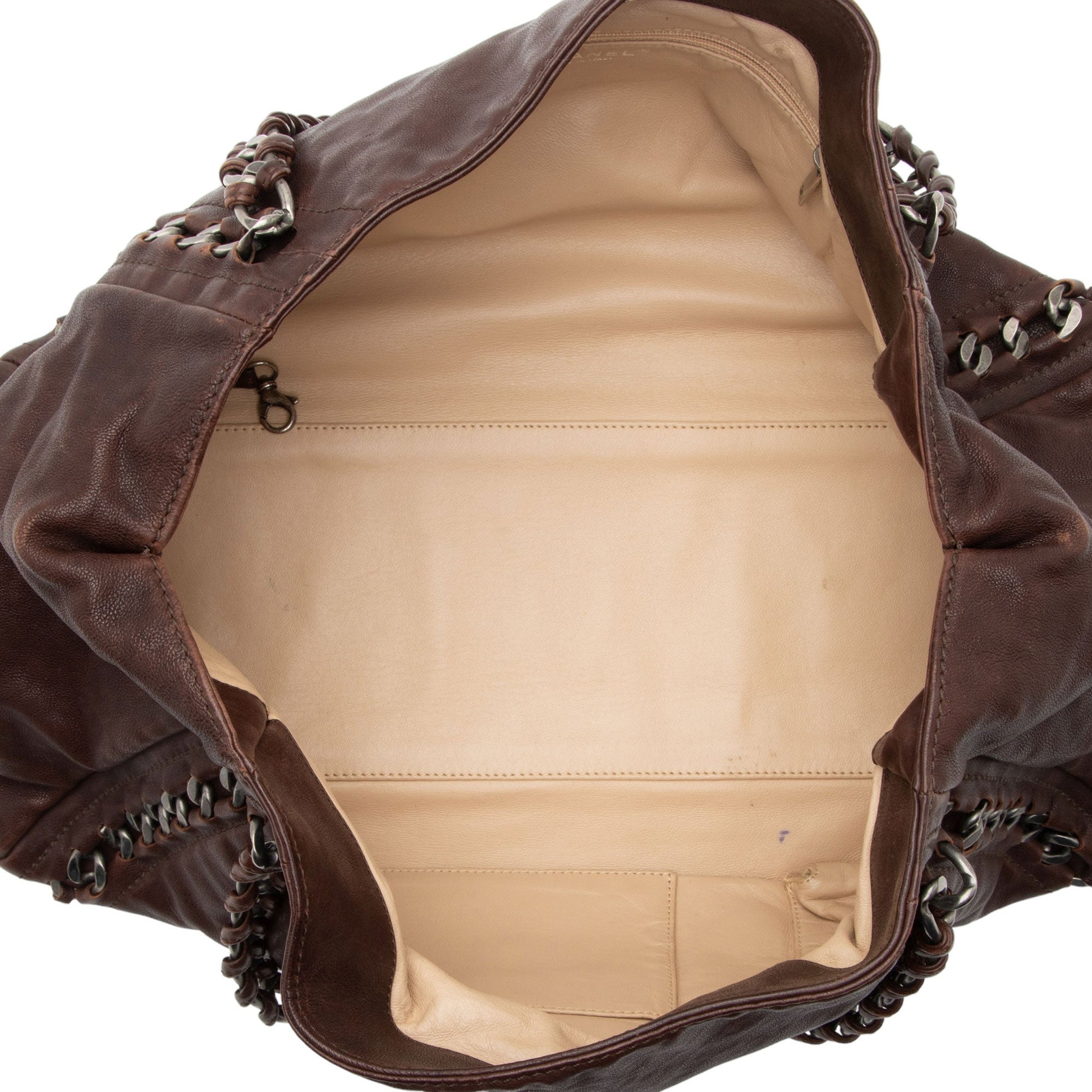 Condition Notes: Visible scuffs to exterior bottom corners. Light creasing and scuffs throughout exterior. Scuffs throughout leather woven into chains. Light surface scratches to hardware. Marks, ink marks, and wear throughout interior. Please note: Read product details carefully. This is a dark brown bag.