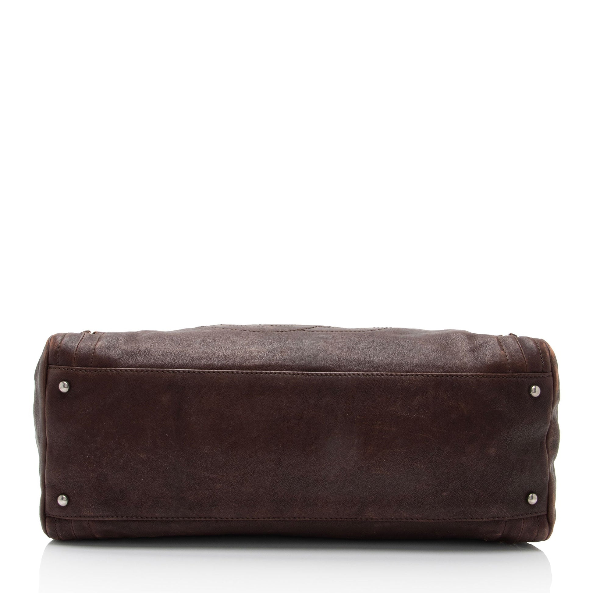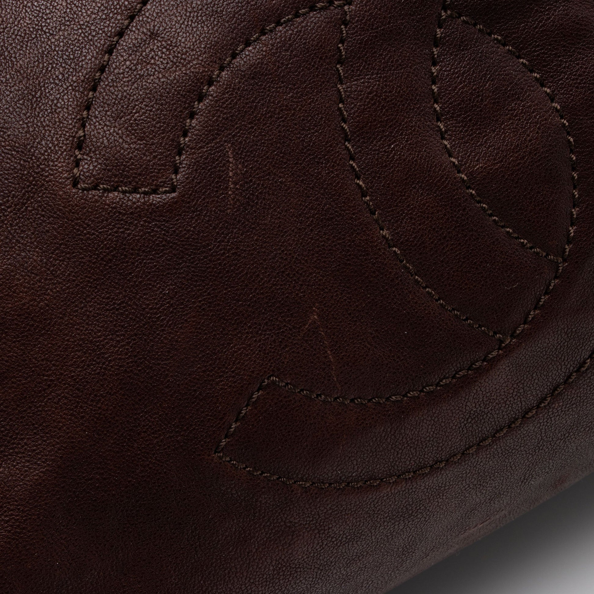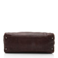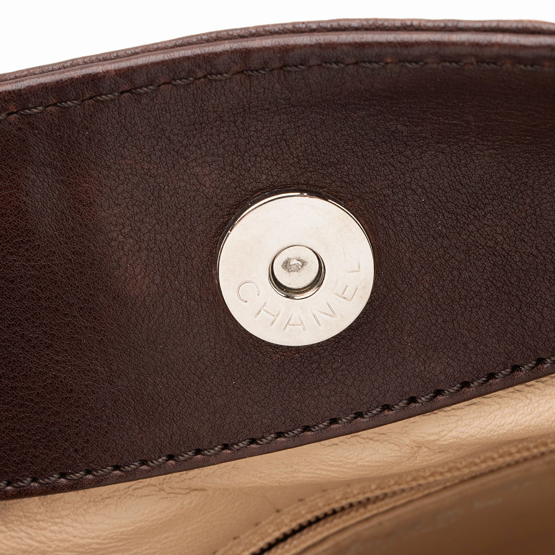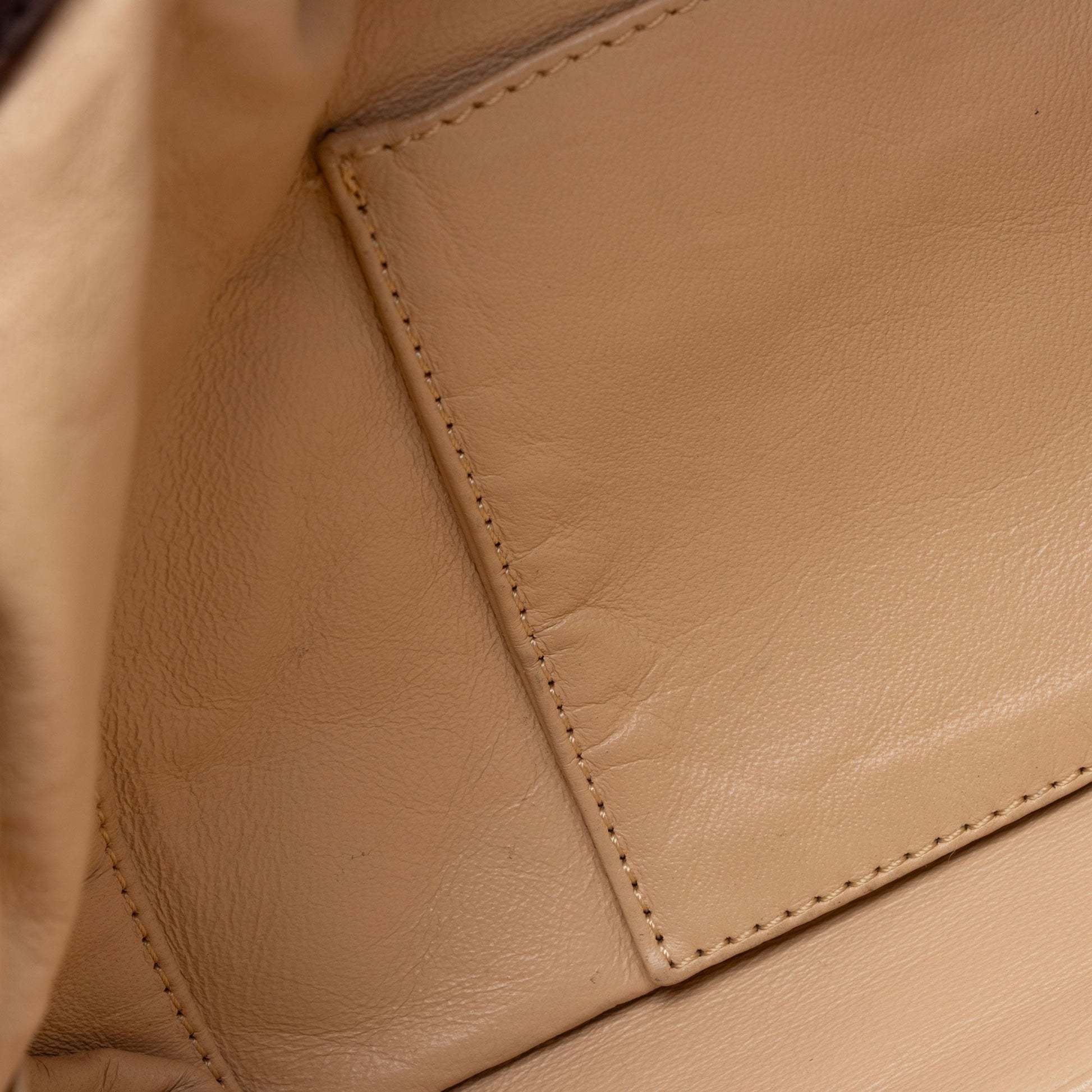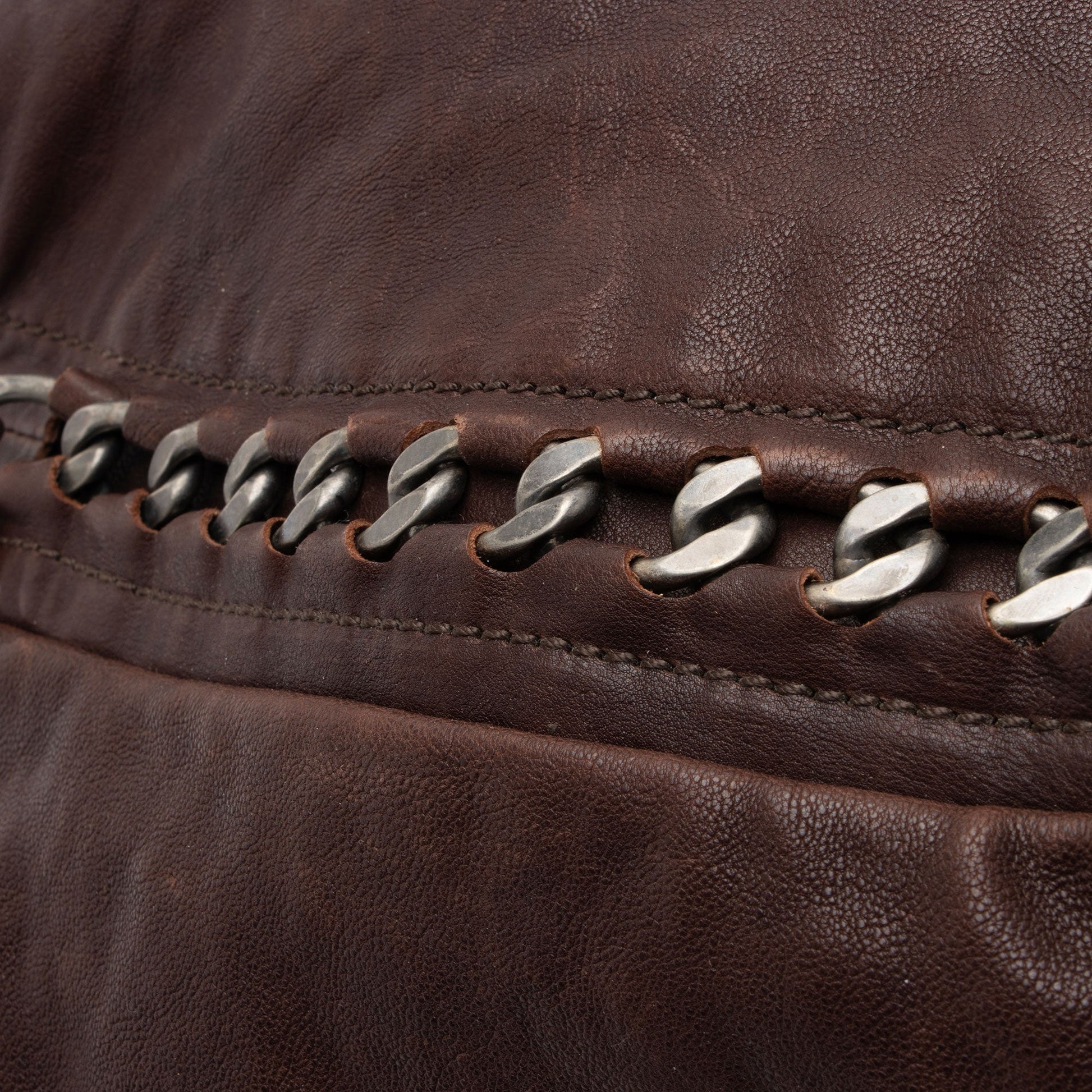 Condition Notes: Visible scuffs to exterior bottom corners. Light creasing and scuffs throughout exterior. Scuffs throughout leather woven into chains. Light surface scratches to hardware. Marks, ink marks, and wear throughout interior. Please note: Read product details carefully. This is a dark brown bag.