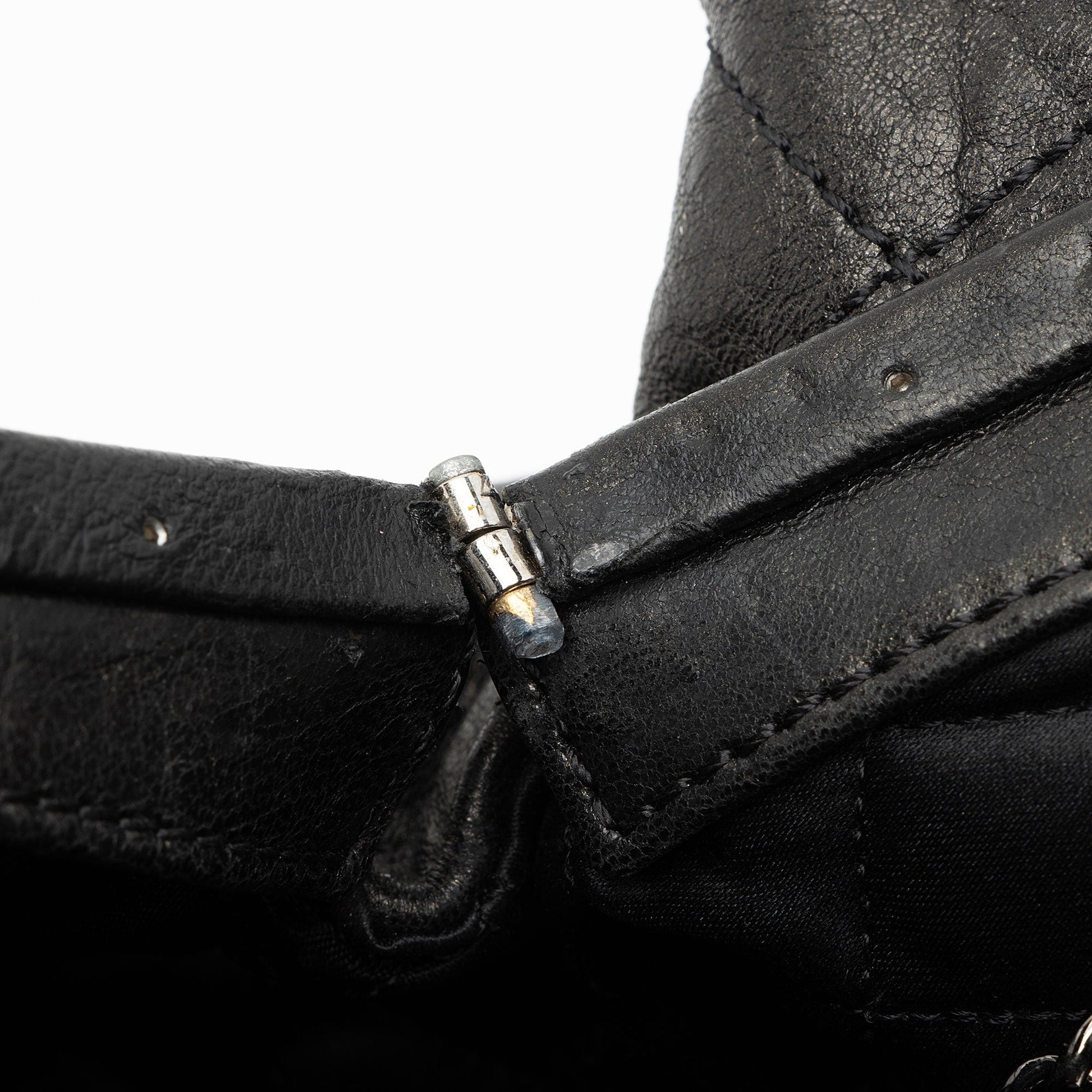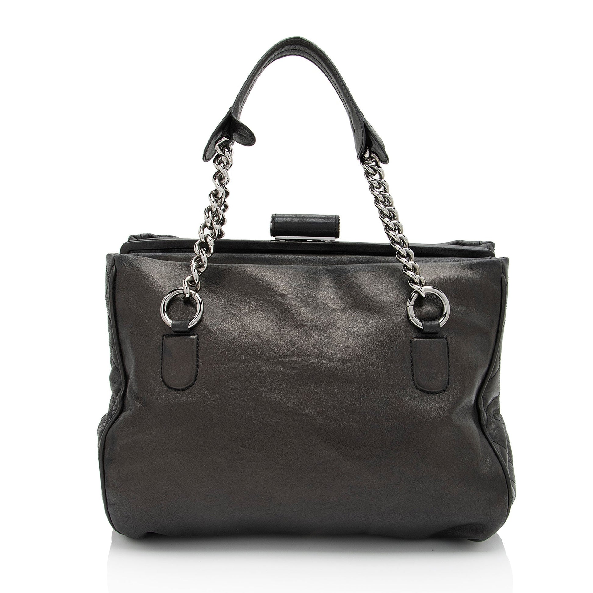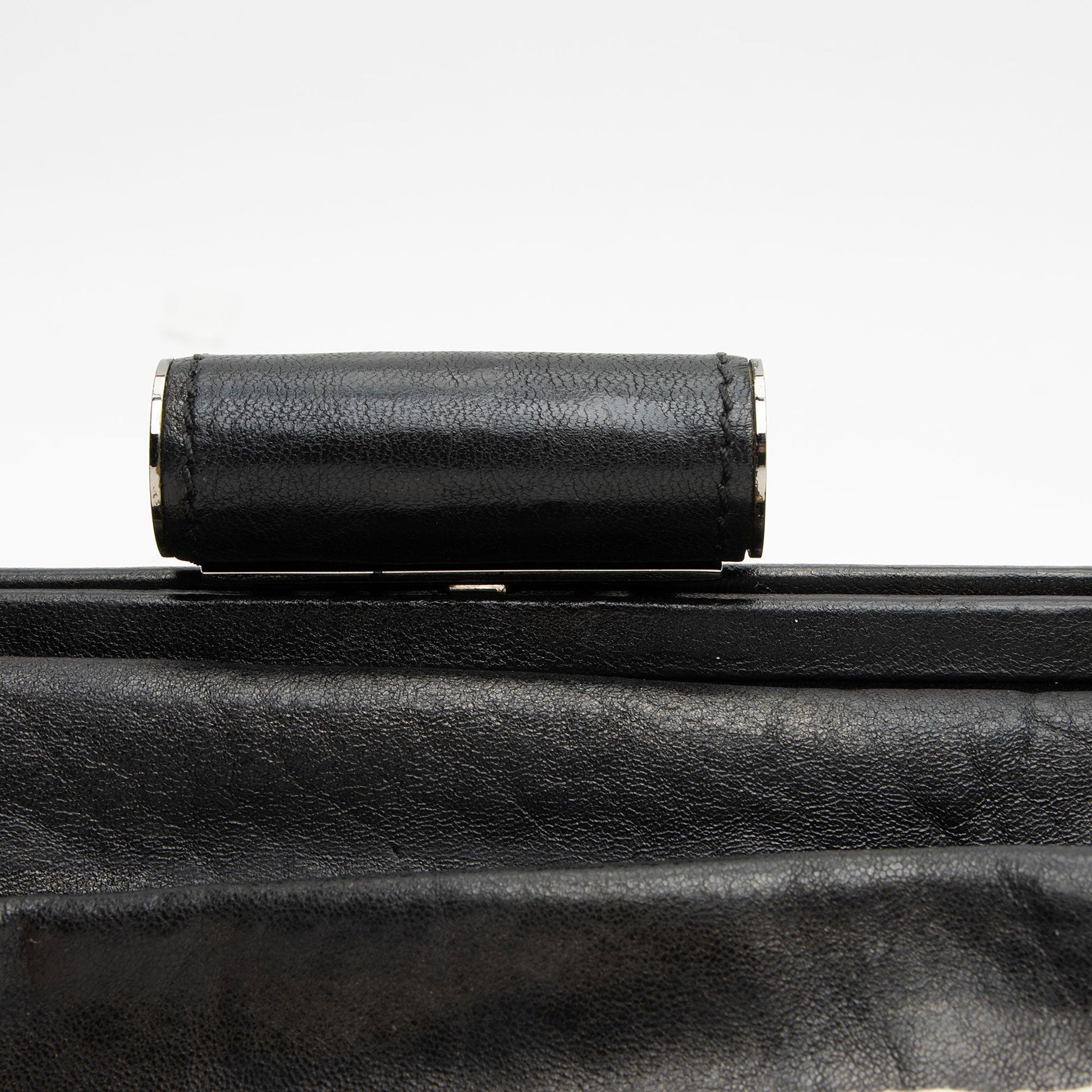 Condition Notes: Light scuffs and wear to exterior bottom corners. Light creasing and scuffs throughout exterior and handles. Surface scratches to hardware. Light marks and wear throughout interior. Light discoloration and wear to interior hologram. Kisslock closure is loose.