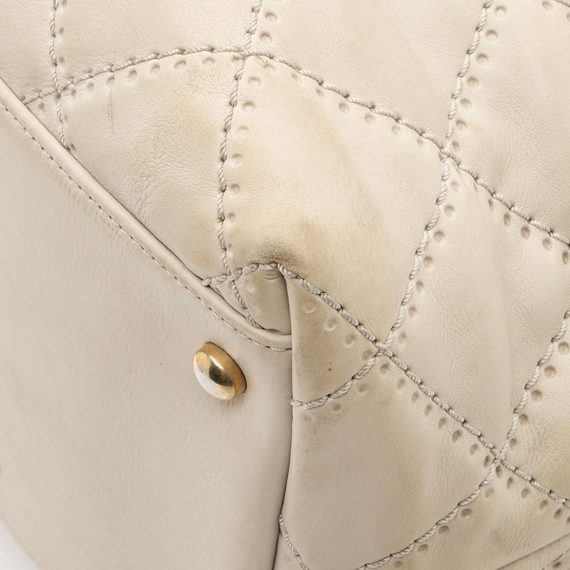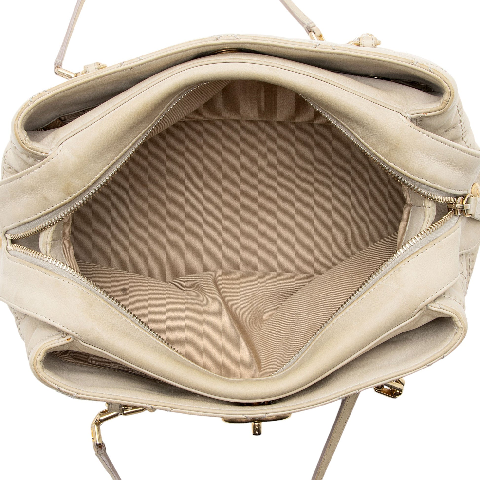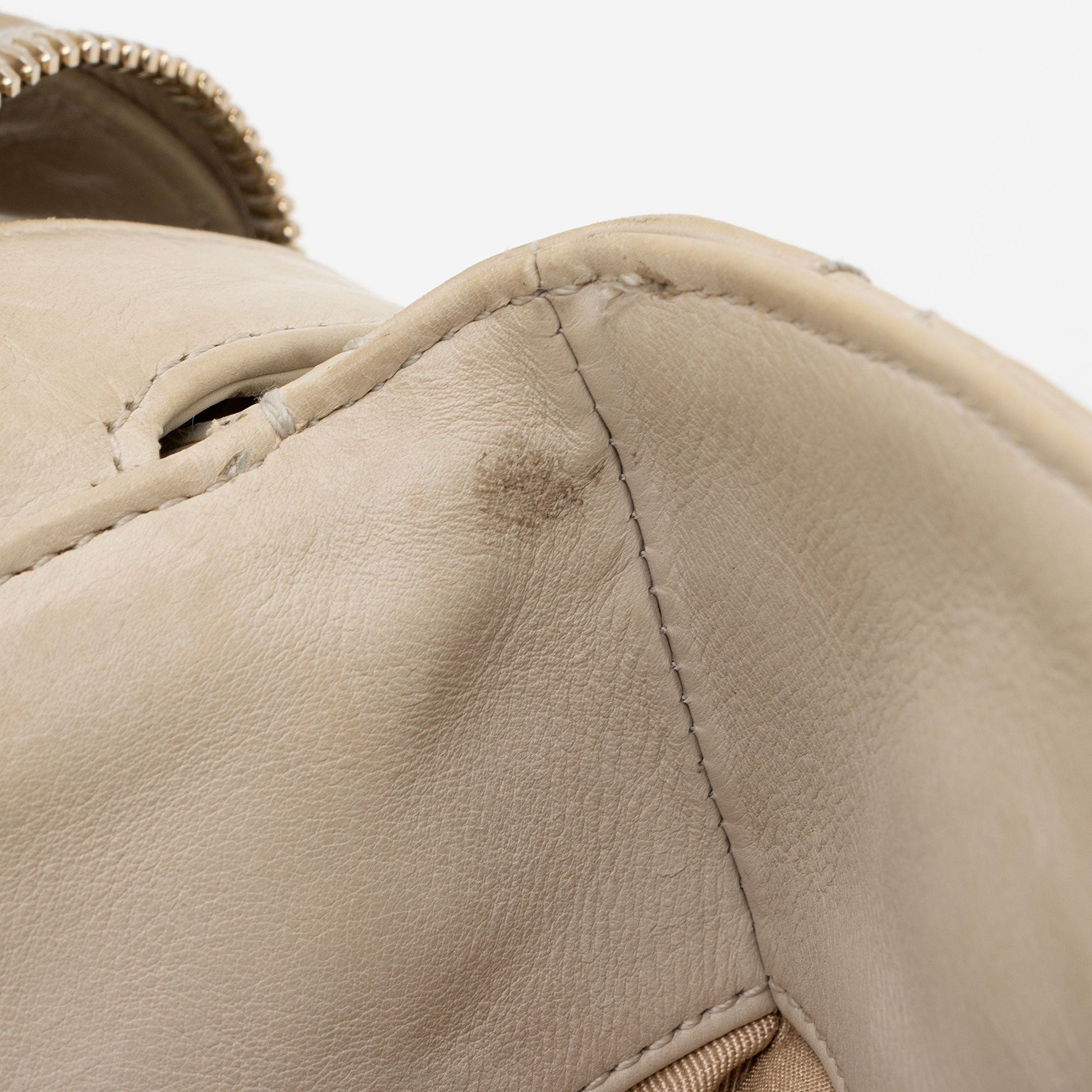 Condition Notes: Moderate creasing throughout exterior causing loss of structure. Moderate discoloration and marks throughout exterior and bottom corners. Cracking and light fraying throughout handle calfskin casing. Heavy surface scratches and tarnishing to hardware. Marks and wear throughout interior.