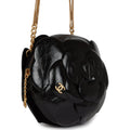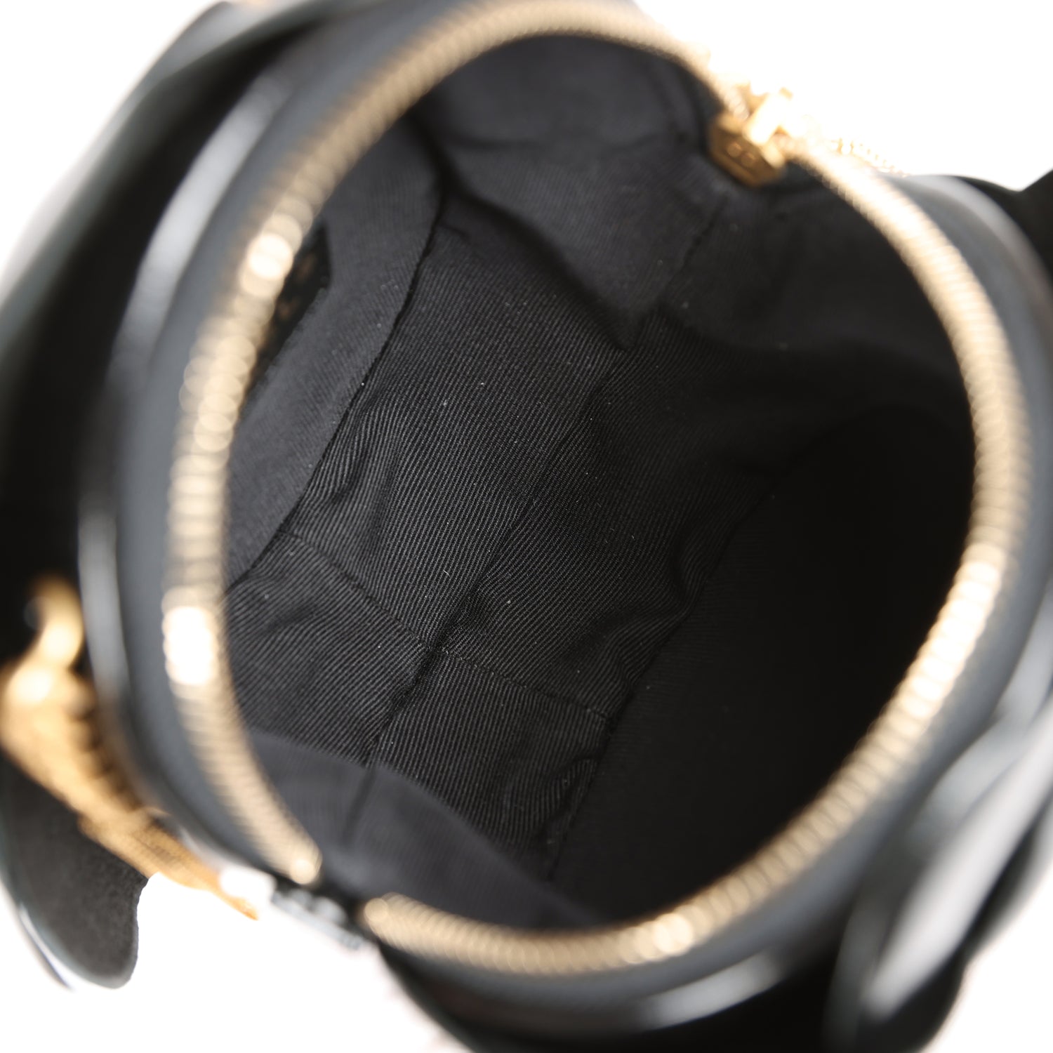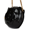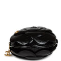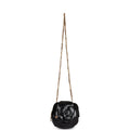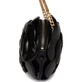 This Camellia Clutch with Chain is of black shiny aged calfskin with gold tone hardware and has a zip top closure and long gold tone chain.