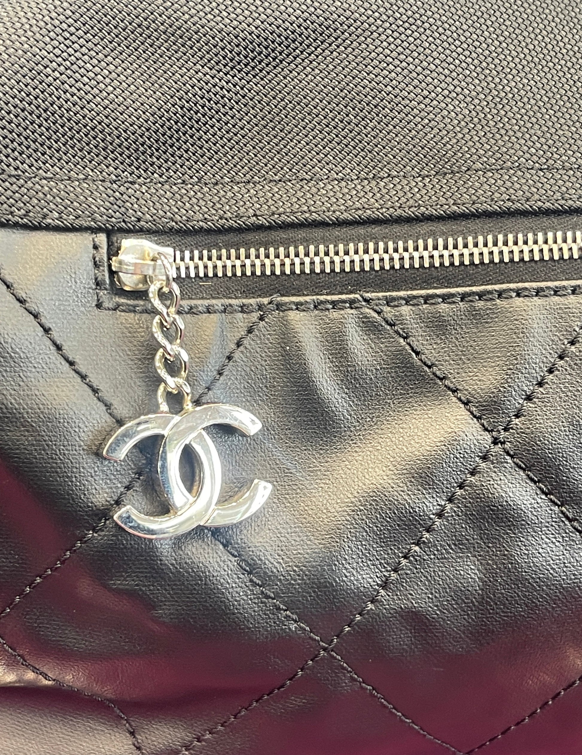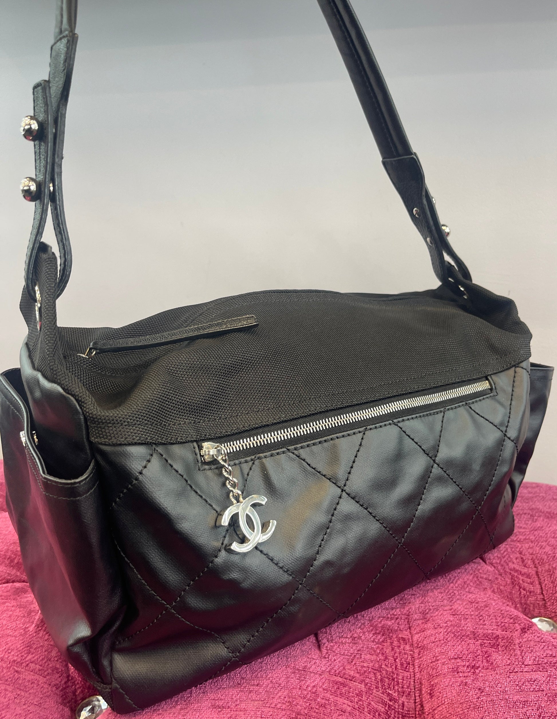 This hobo tote by Chanel is made of quilted Canvas with a Nylon top. The bag features a single nylon top handle, a hanging Chanel CC charm from the side pocket zip, a quilted diamond stitched bottom half, a zip closure and a fabric interior with zipper and patch pockets. Originally purchased in 2007.