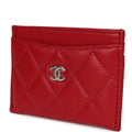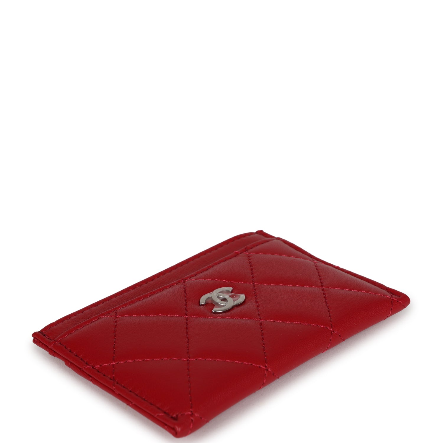 This Chanel Cardholder is in Red lambskin with silver hardware, features a "CC" signature on the front and signature half-moon pocket on front and back, slit pocket behind center pouch, and the center pouch is lined with red grossgrain fabric.