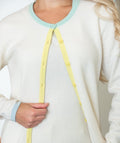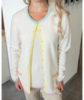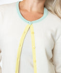 Shop this Chanel Cashmere Mixed Ensemble Cardigan Top in cream detailed with green and yellow trims.