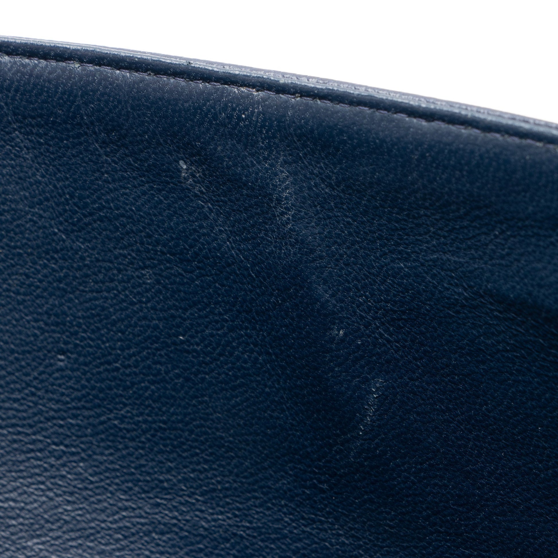 Condition Notes: Light scuffs and minor loss of texture to exterior bottom corners and flap corners. Light surface scratches to hardware. Minor scuffs and wear throughout interior. Please note: Read product details carefully. This is a dark blue bag.