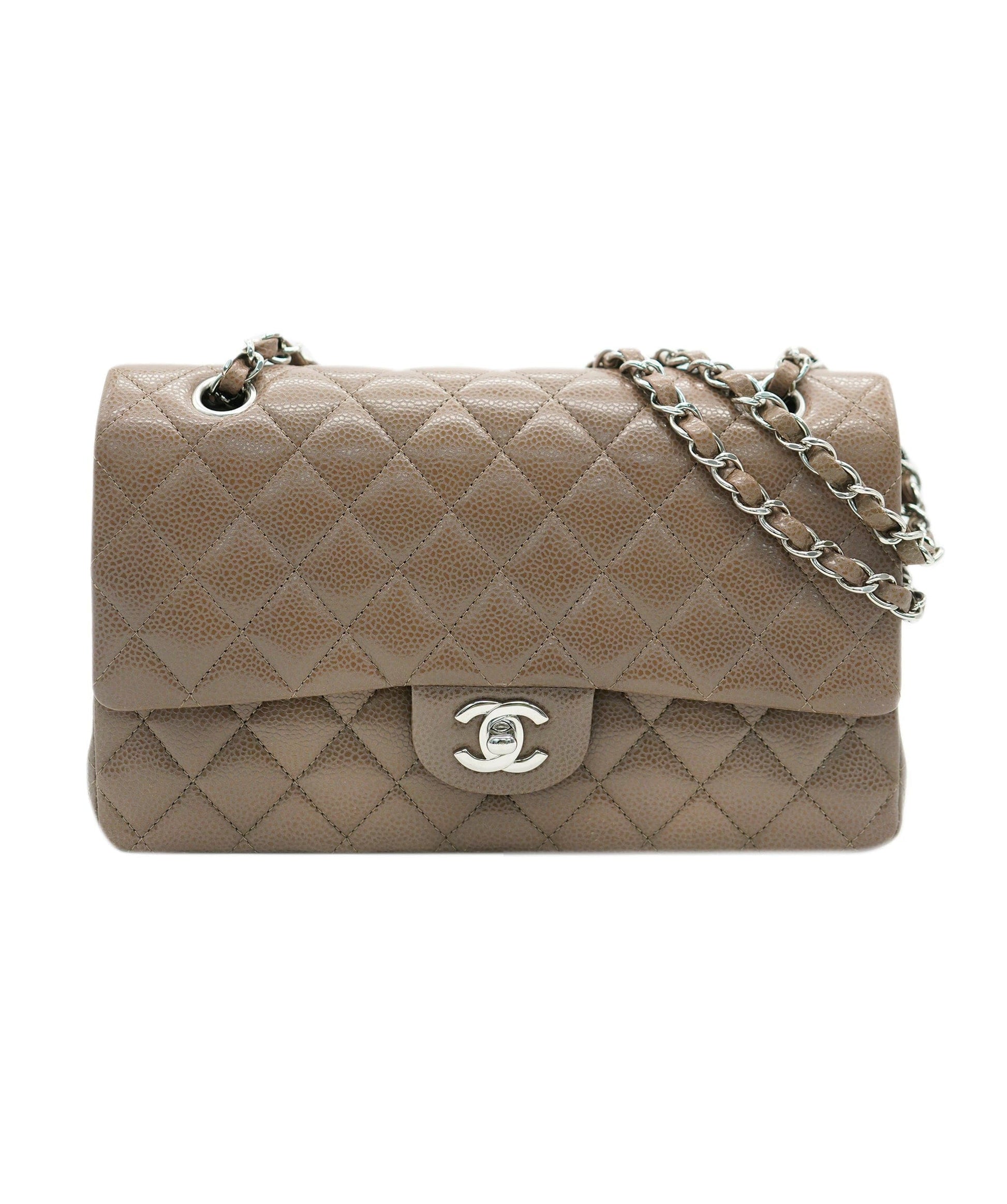 Description: Shop this beautiful Chanel medium caviar light brown classic flap with SHW, coming full set. but in New condition. Serial 14025007