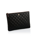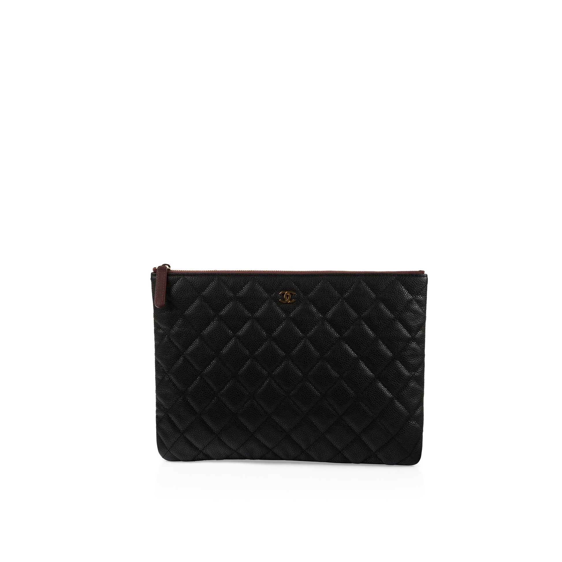 Crafted from Chanel's classic Caviar Leather, Chanel presents their classy and practical O-case pouch. With the signature CC logo in gold tone hardware, this piece is sleek, stylish and sophisticated. Wear this piece with any casual look, from a basic tee and a pair of trousers to black jeans and a simple blouse. The ideal every day clutch, the O-Case by Chanel is understated and elegant while remaining timeless and fashion forward.