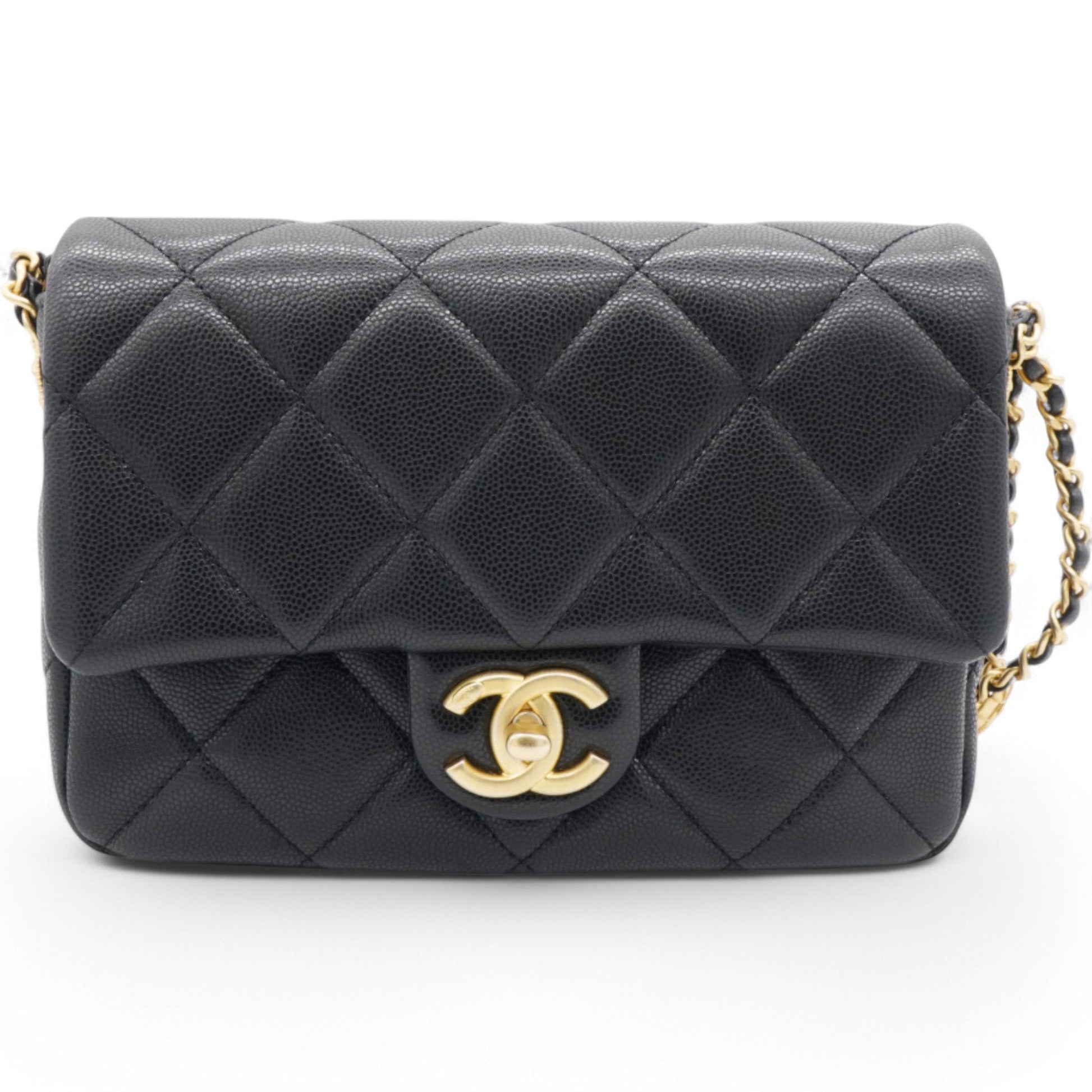 | The chic mini crossbody classic is crafted in soft quilted caviar leather in black. The bag features an aged gold chain link leather threaded shoulder strap and a facing classic aged gold CC turn lock. This opens the flap to a red fabric interior with a patch pocket. | Material: Leather Lining: Textile Hardware: Gold color finish metal Accessories: Serial Number: U03H9UT8 | ![]() |
