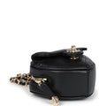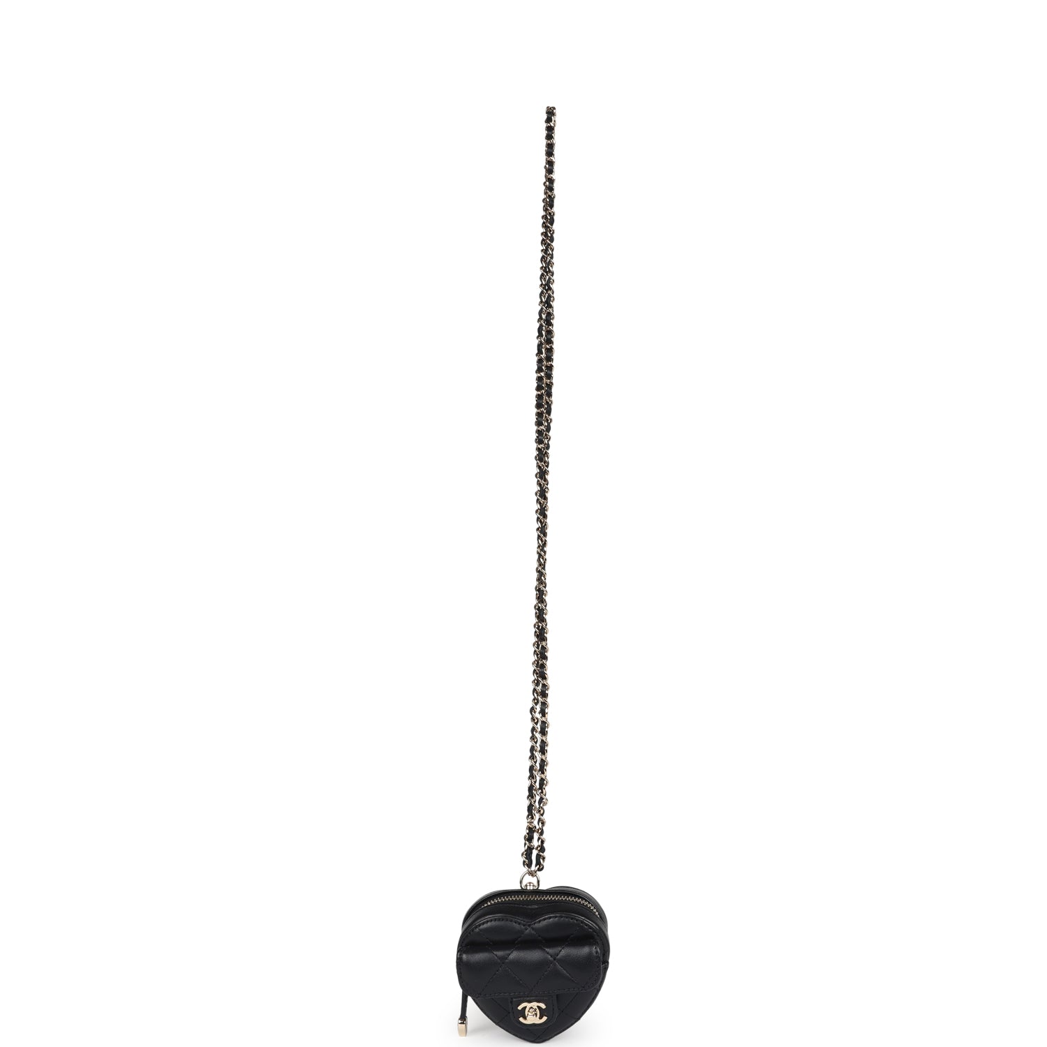 This CC In Love Heart Necklace bag is in black lambskin leather with light gold tone hardware and features a front flap with signature CC turnlock closure, zip top closure and an interwoven light gold tone chain link and black leather strap.