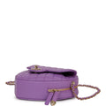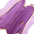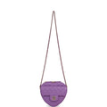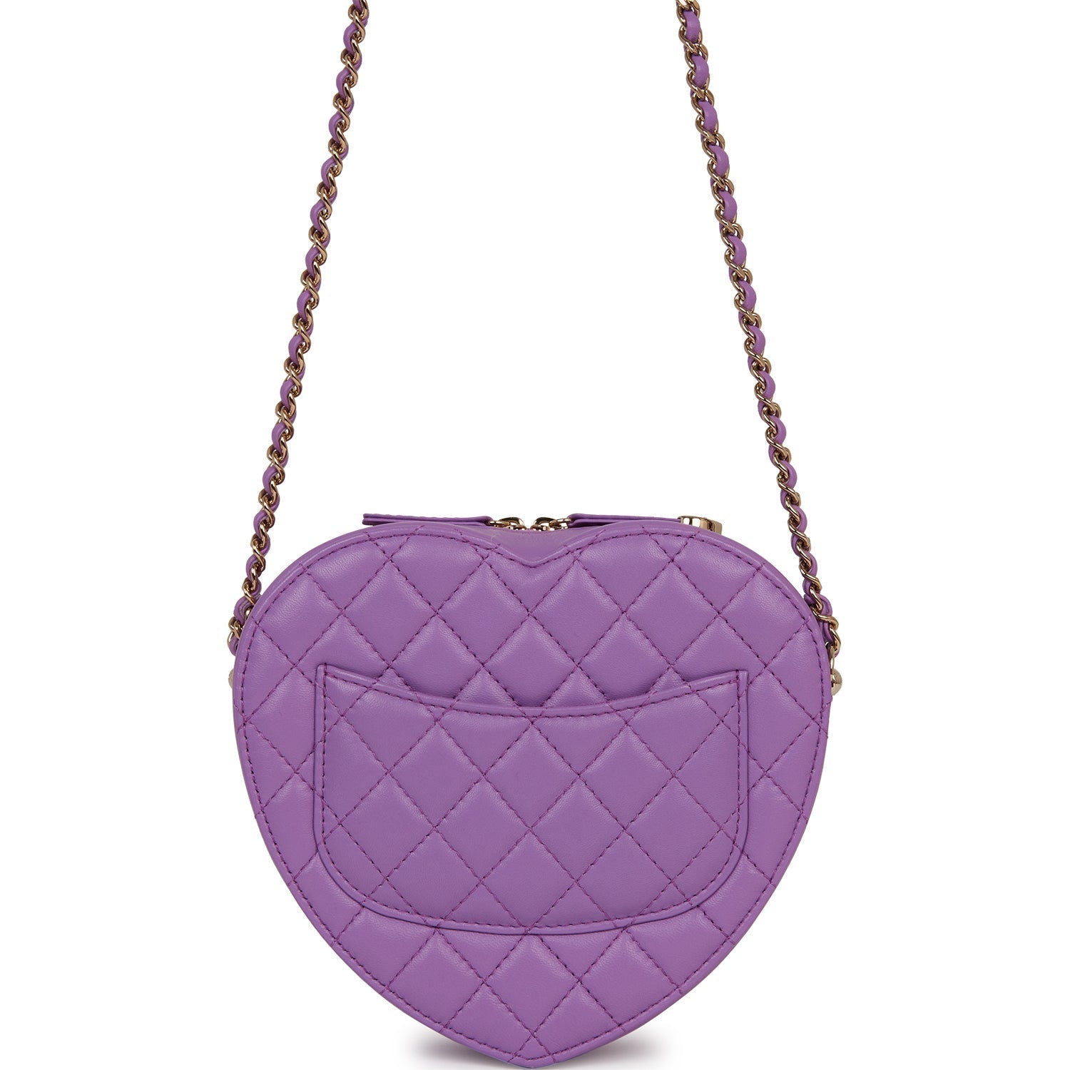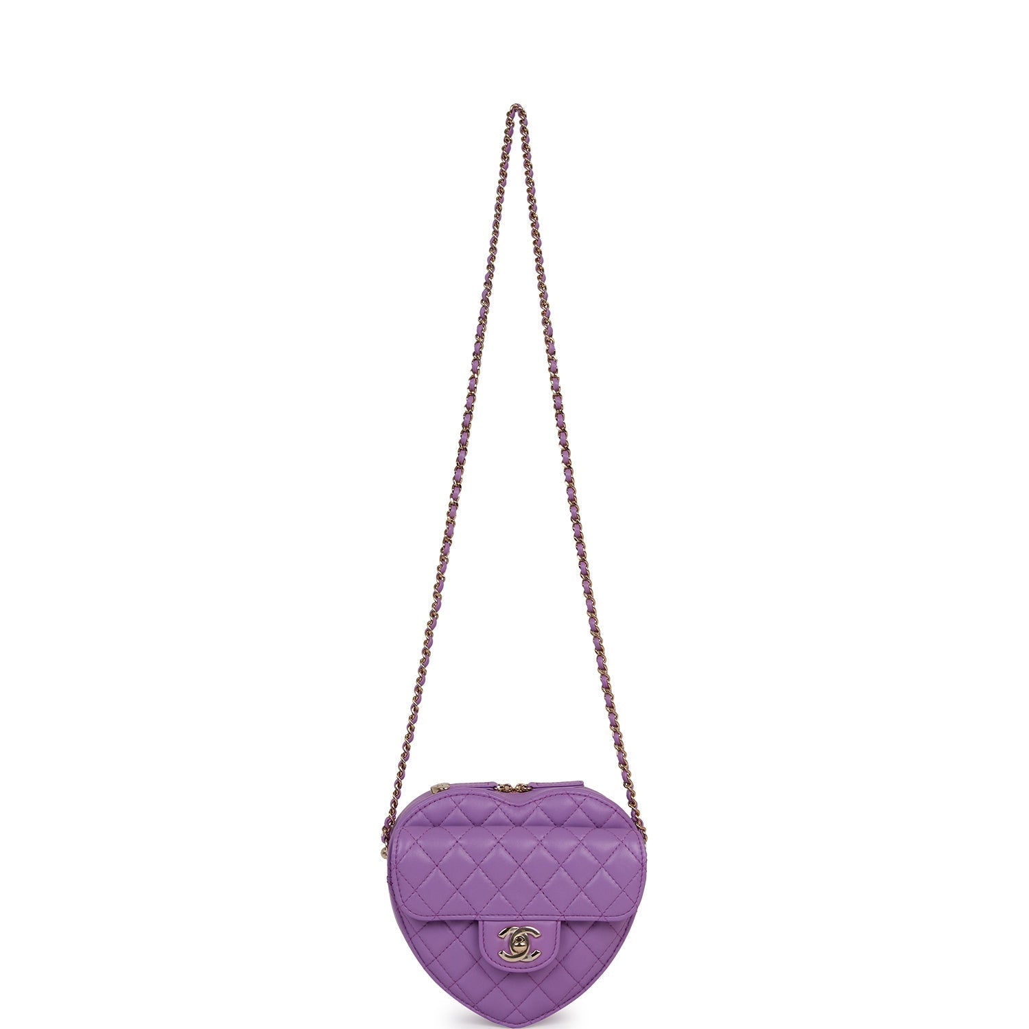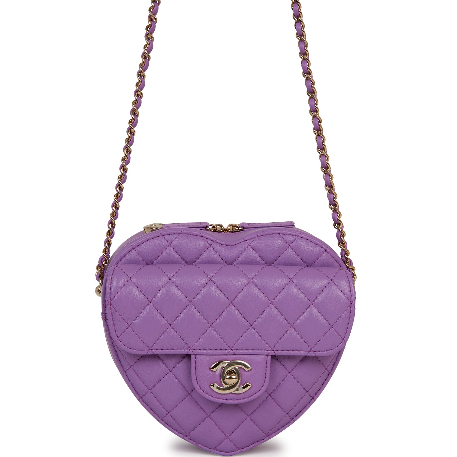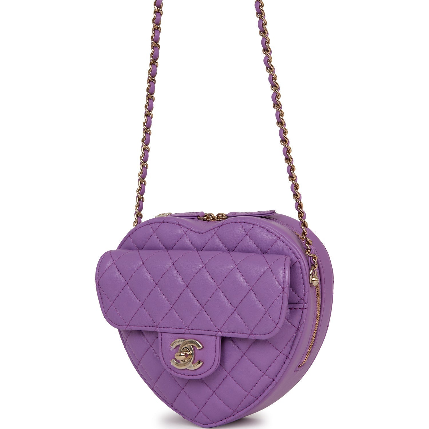 This CC In Love Large Heart bag is in purple lambskin leather with light gold tone hardware and features a front flap with signature CC turnlock closure, half moon back pocket, zip top closure and an interwoven light gold tone chain link and purple leather shoulder strap.