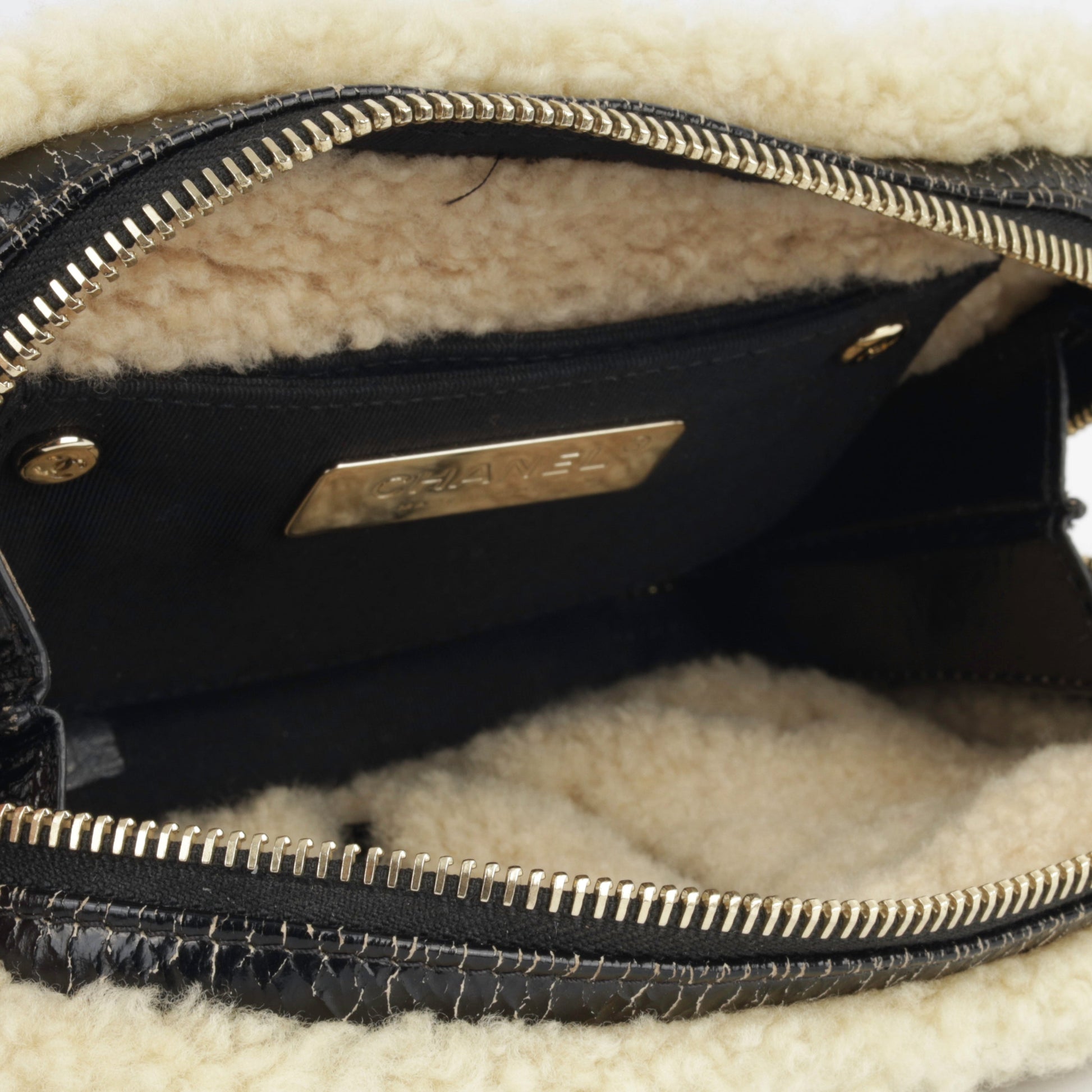 From the 2019 collection, the CC Mania Waist Bag is crafted from shearling and black shiny crumpled sheepskin, with a champagne gold-tone hardware. The adjustable belt allows the style to be worn as a belt bag or over the shoulder.