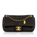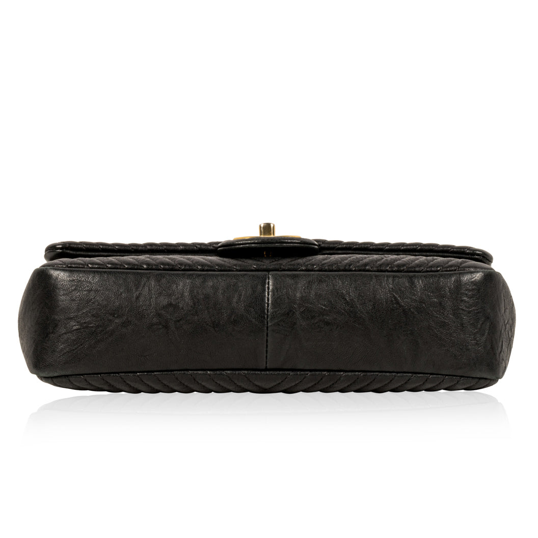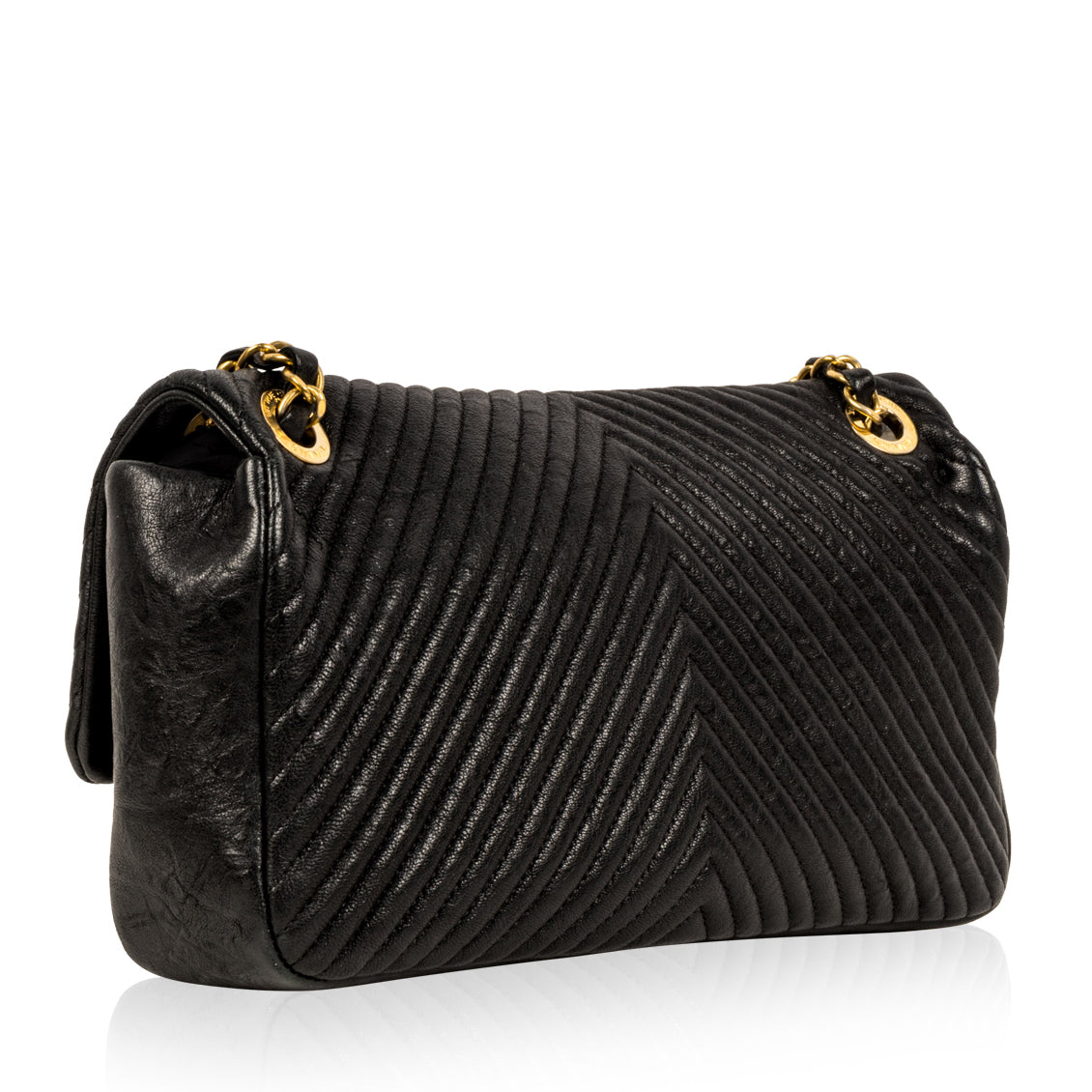 A necessary item in every woman's wardrobe, the Chanel Classic Flap is beautiful, timeless and a true investment piece. One of the most iconic bags in history, Chanel Classic Flaps never lose their value. Carefully crafted in black leather with a chevron design, this Flap bag is the ideal companion to take you from day to night. Carry all your daily essentials inside the spacious interior while remaining sleek and sophisticated. Featuring luxurious gold tone hardware and interwoven leather-chain strap, you can wear this piece with anything you have in your wardrobe. Effortlessly chic and always in style, it's safe to say you need it in your life.
