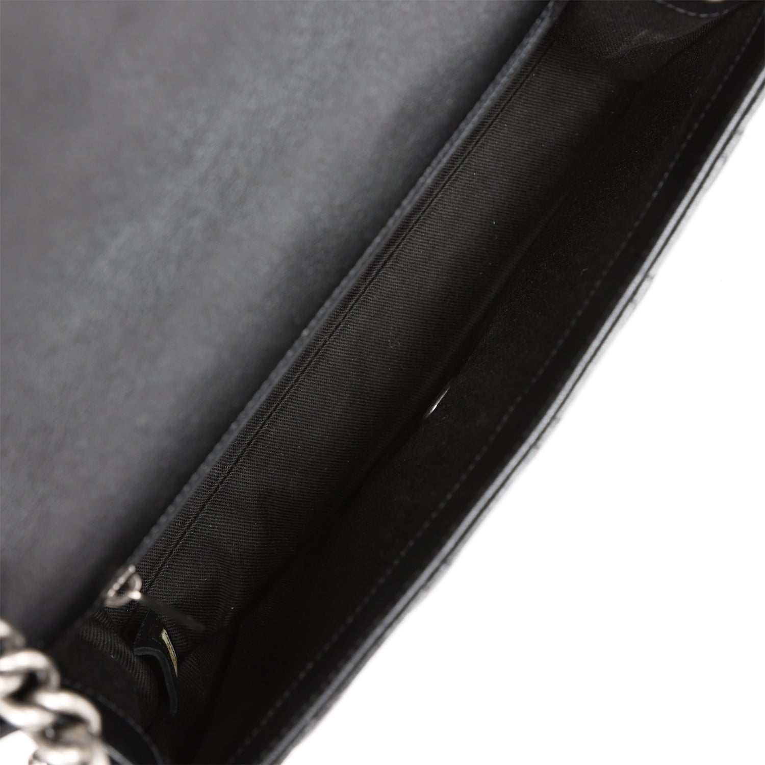 This Medium City Rock bag is in Black Goatskin with Ruthenium hardware, black tonal stitching, one back pocket, and a CC pushlock closure. The bag features a black interwoven leather shoulder strap with Ruthenium toned chain.