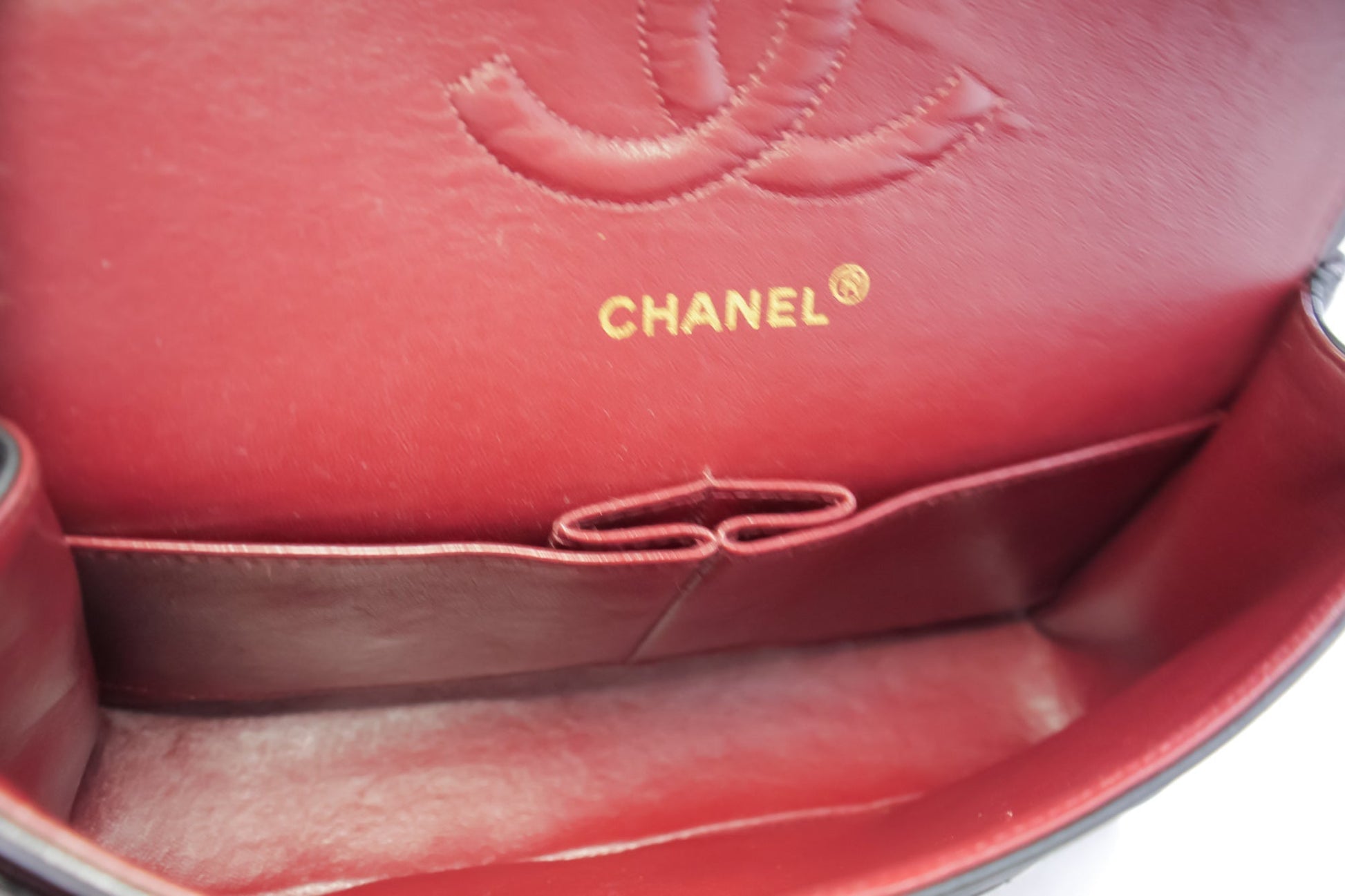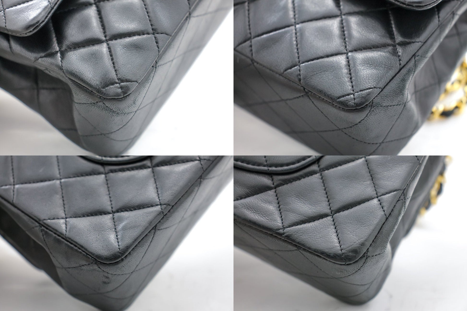 Overall: 8 of 10 - The outside is in excellent condition with minimal signs of use only. Slight scratches. The inside is also excellent and very clean with slight scratches. No stickiness or peeling. All chains and hardware are shiny and excellent. The dust bag and box are also great. Highly recommended!