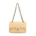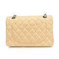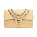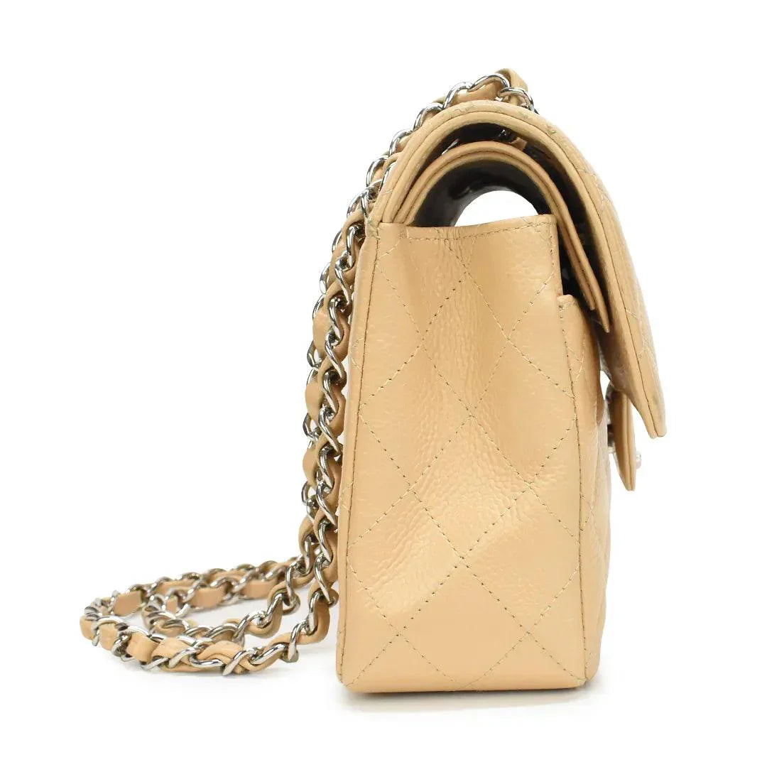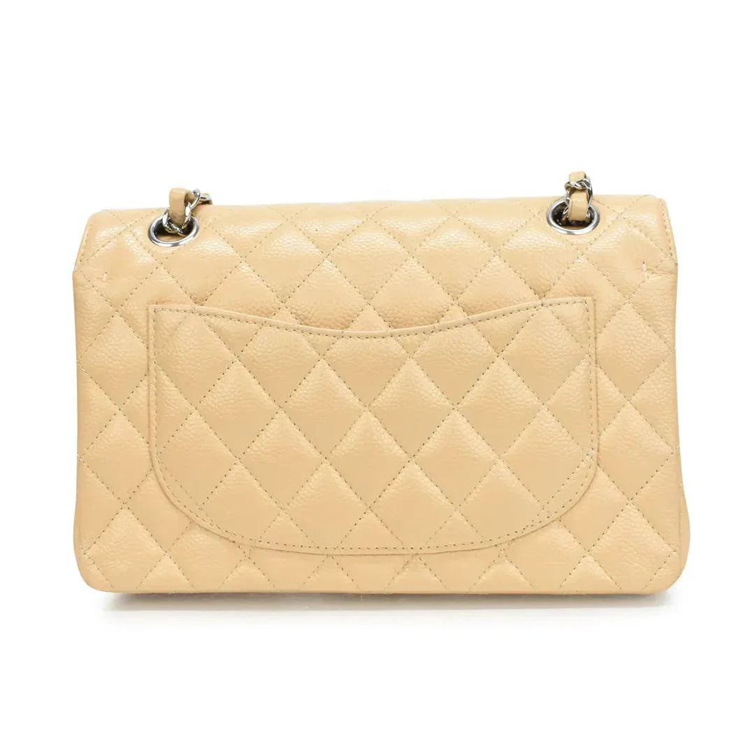 Chanel small 'Classic Double Flap' in diamond quilted beige caviar leather with silver hardware. Features an interlocking CC turnlock closure, an interior flap with snap button, and leather lining with slip pockets. There are additional slip pockets on the front and back of the back. The leather woven chain strap can be worn long or doubled up and worn shorts. Circa 2019.