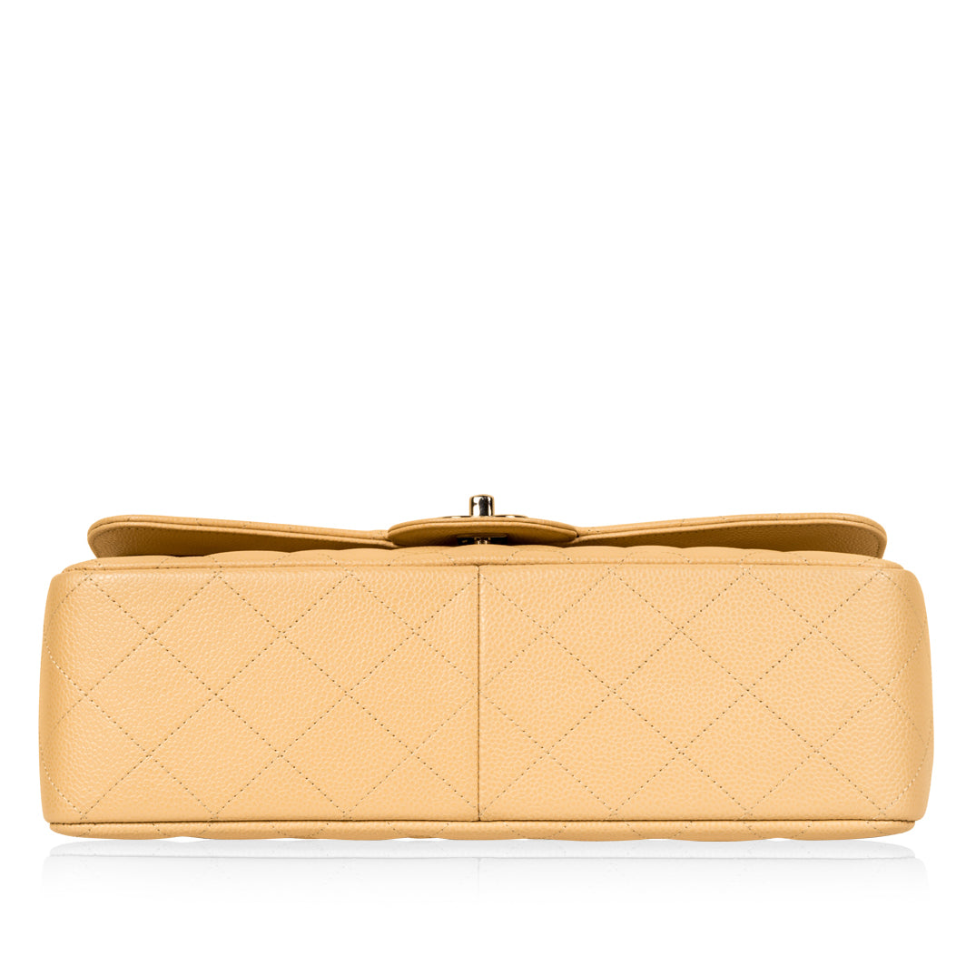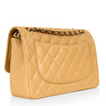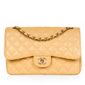 Chanel continues to present its signature line of Classic Flap bags. Inspired by the original Re-Issue Flap Bag and created by Karl Lagerfeld, the Classic Flap is perhaps the most acclaimed bag in all of fashion history. Timeless, elegant and sophisticated, it's no wonder the Classic Flap is, well, a classic. Featuring its infamous quilted lambskin leather and interwoven chain / leather strap, the Jumbo is an absolute must-have in any luxury handbag collection. Not only is this highly coveted, stunning beige bag the perfect accessory to compliment anything in your wardrobe, but it's also an investment piece that will never lose its value. Embodying elegance and traditional femininity to a T, a Chanel Classic Flap Bag is a purchase you won't ever regret.