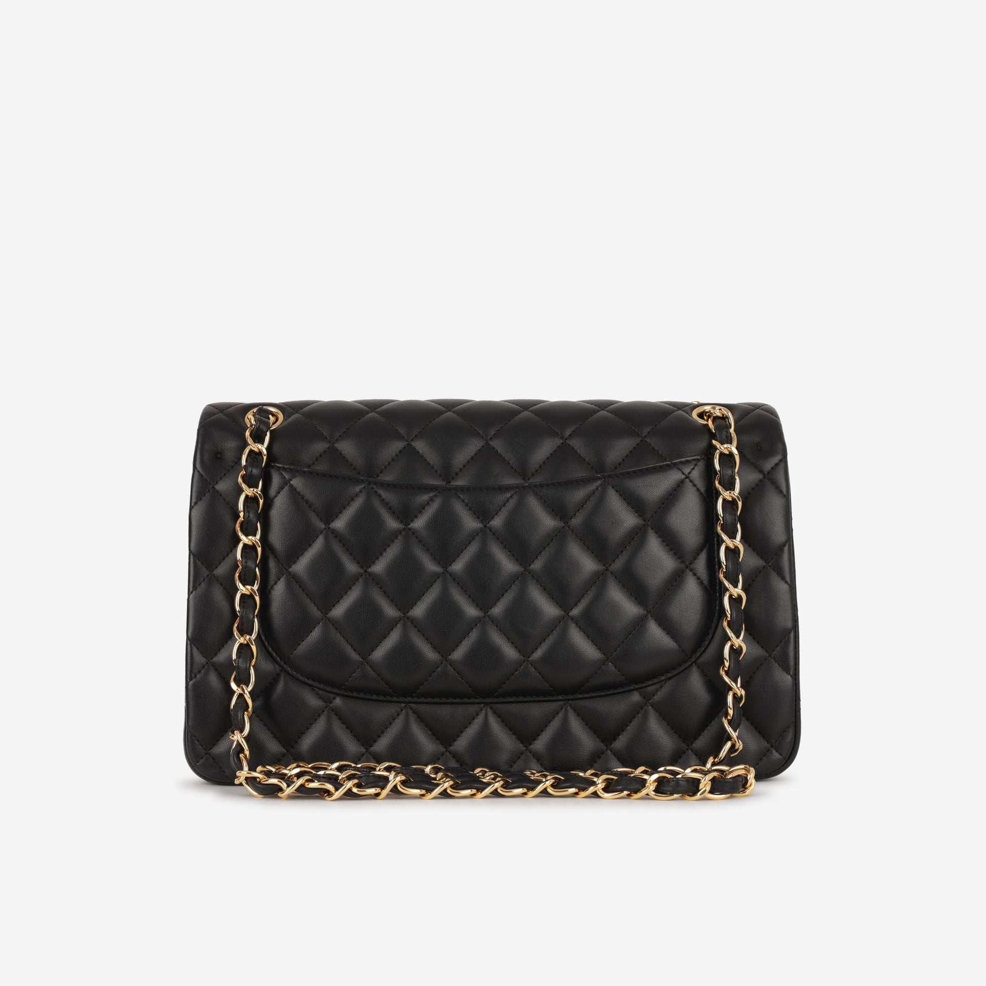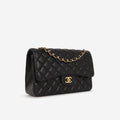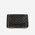 The Chanel Jumbo Classic Flap in Black lambskin leather with Gold Hardware is available now. Crafted from durable, quilted caviar leather, it features the iconic CC turn-lock, double flap, and leather-woven chain strap. Spacious and timeless, this jumbo size is perfect for everyday elegance. The gold-tone hardware adds a classic finish to the signature black exterior.