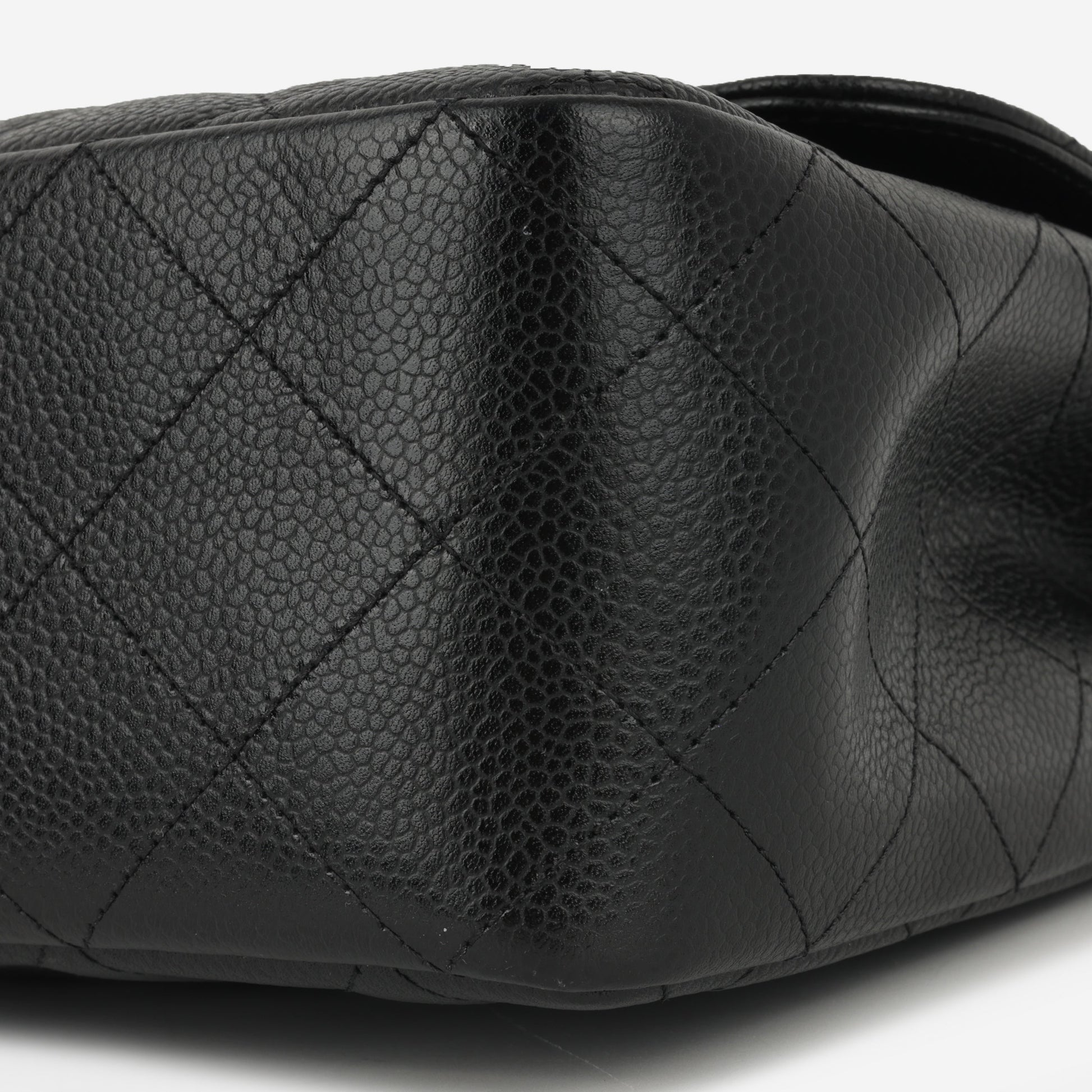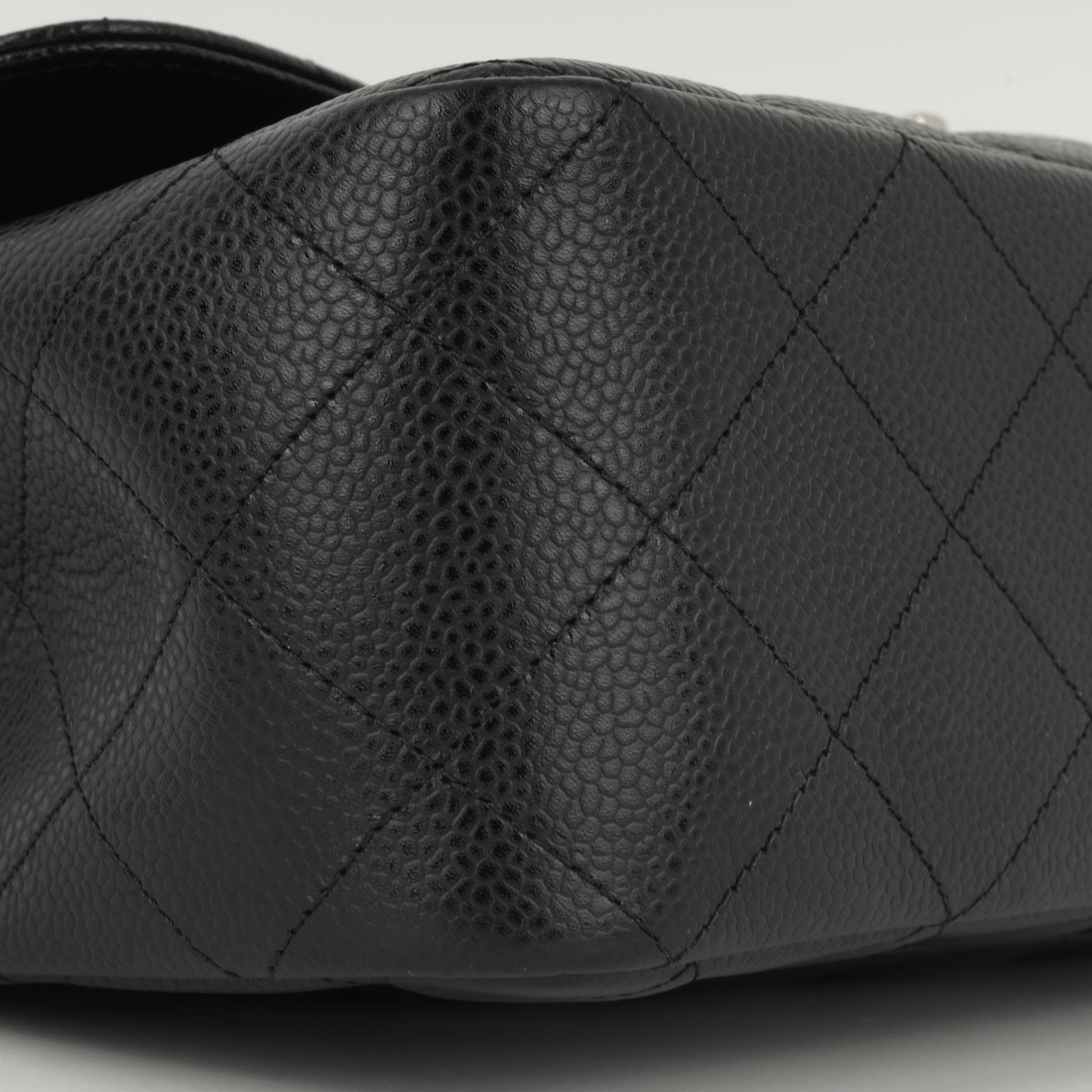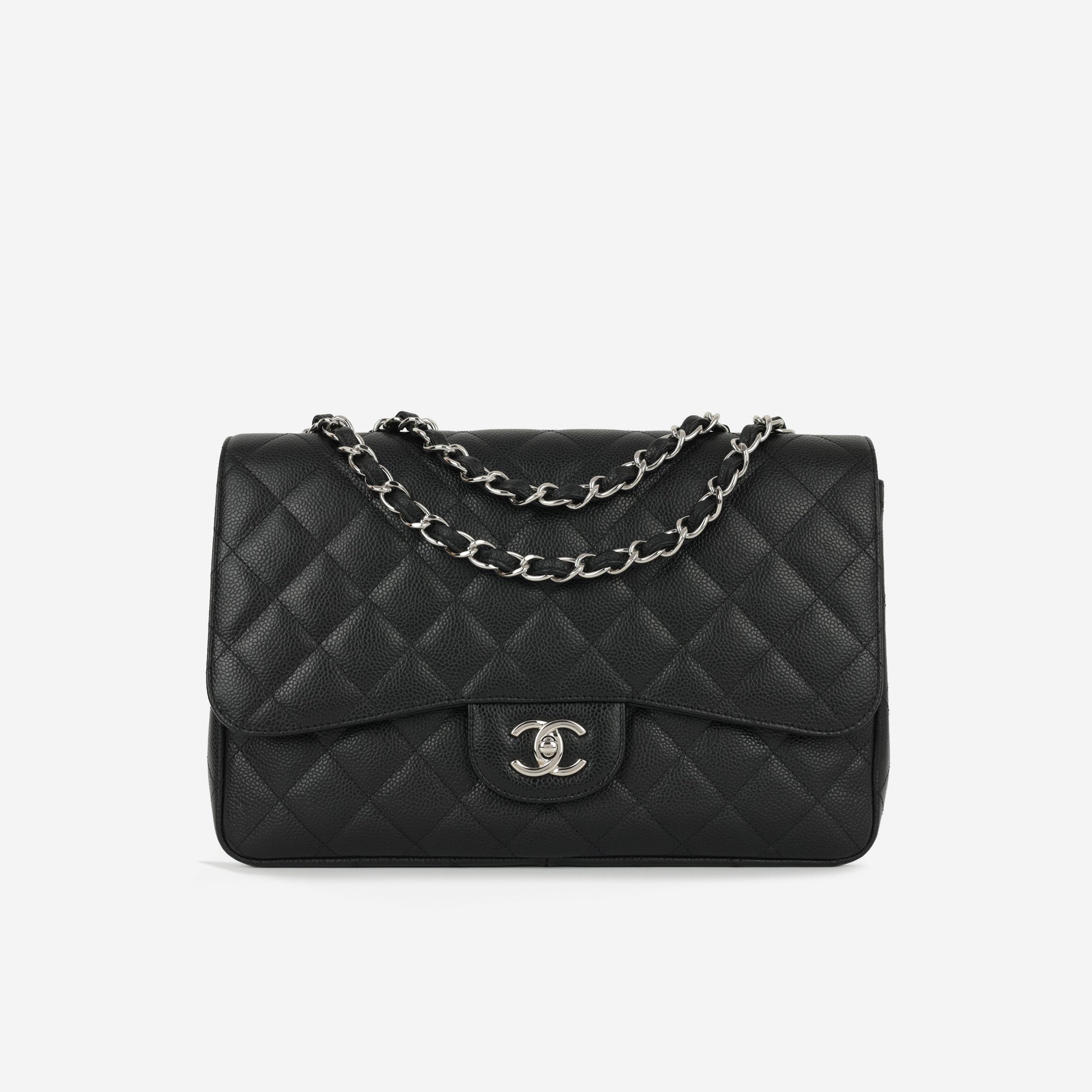 A timeless expression of elegance and luxury, the Chanel Jumbo Classic Flap Bag in black caviar leather with silver-tone hardware is a must-have for any Chanel collector or fashion enthusiast. This rare and discontinued single flap version from 2010 is prized for its lighter structure and increased interior capacity compared to the double flap.