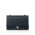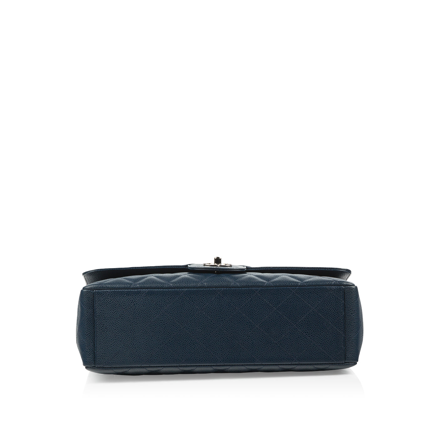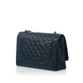 Eloquent and elusive, Chanel presents the Maxi Classic Flap in Navy Caviar leather. With its unprecedented quilted design and magnificent silver hardware, it is evident that Karl Lagerfeld can do no wrong. Featuring the fashion house’s quintessential CC clasp closure and their interwoven leather and chain shoulder strap, the bag can be showcased as a shoulder bag or doubled up. Widely celebrated for its versatility and the ability to be worn with anything in one’s wardrobe, the Chanel Maxi Classic unarguably celebrates chic femininity.