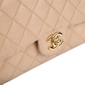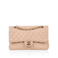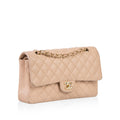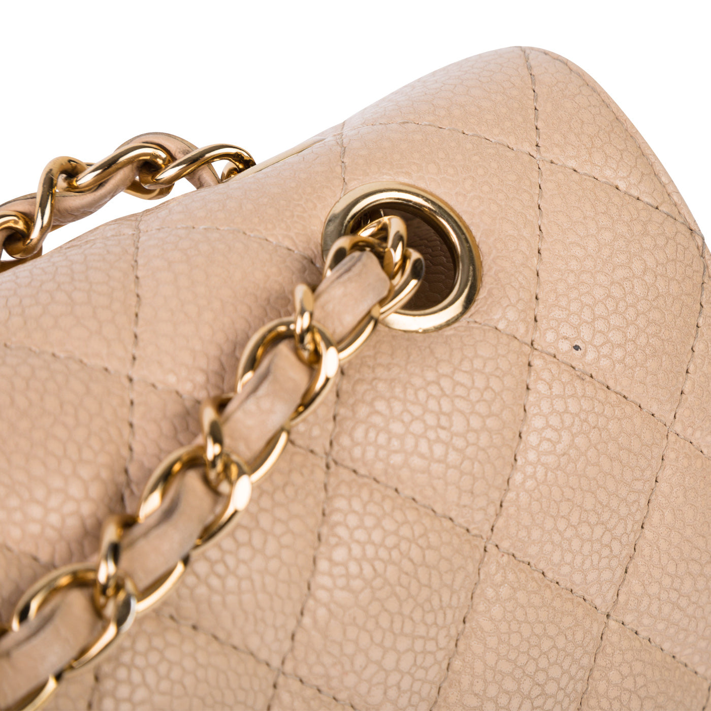 Under the creative direction of Karl Lagerfeld, Chanel continues with its line of classic quilted bags. The enviable Double Flap bag is crafted in strong and durable 'Caviar' leather, and detailed with fine stitching and silver hardware. The chain is interwoven with leather and can be worn on either a single shoulder strap or doubled up. The neutral color means this bag fits seamlessly into any wardrobe, and it can stay in there forever!