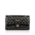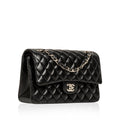 Under the creative direction of Karl Lagerfeld, Chanel continues with its line of classic quilted bags. This special bag is a vintage edition to the modern day versions. The enviable Double Flap bag is crafted in hard wearing caviar leather, and detailed with fine stitching and silver hardware. The chain is interwoven with leather and can be worn on either a single shoulder strap or doubled up. The classic black colour means this bag fits seamlessly into any wardrobe, and it can stay in there forever! The Classic Flap from Chanel is a true investment piece - in the timeless combination of black and silver.
