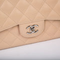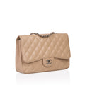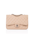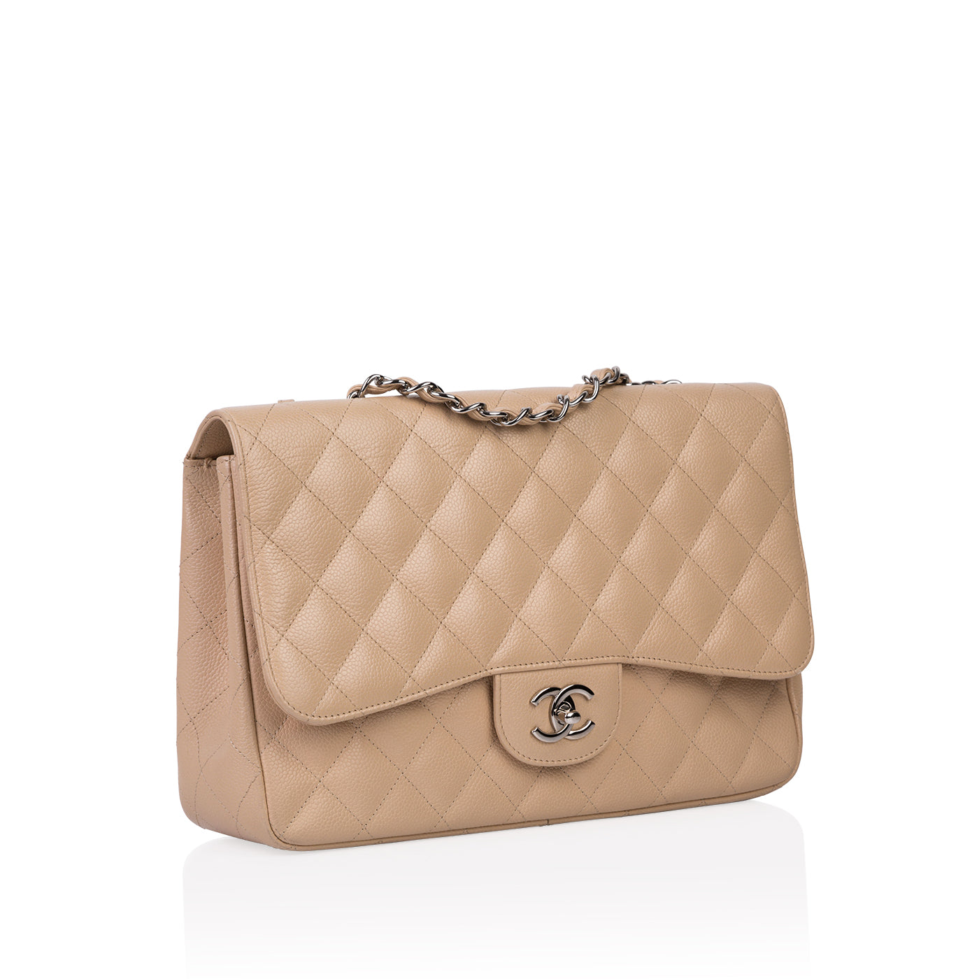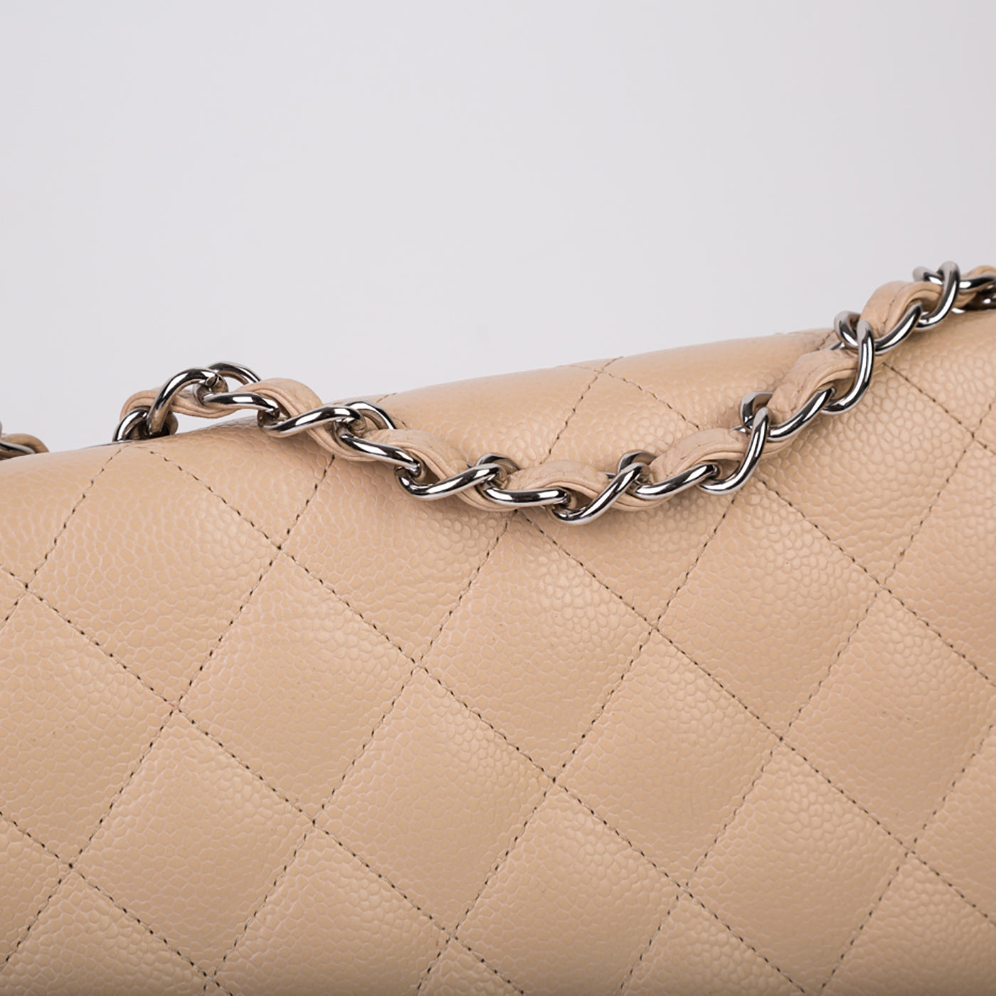 Under the creative direction of Karl Lagerfeld, Chanel continues with its line of classic quilted bags. This Classic and discontinued Single Flap bag is crafted in sturdy yet soft Caviar Leather, and detailed with fine stitching and silver tone hardware. The chain is interwoven with leather and can be worn on either a single shoulder strap or doubled up. The neutral colour means this bag fits seamlessly into any wardrobe, and it can stay in there forever! The Classic Flap from Chanel is a true investment piece.