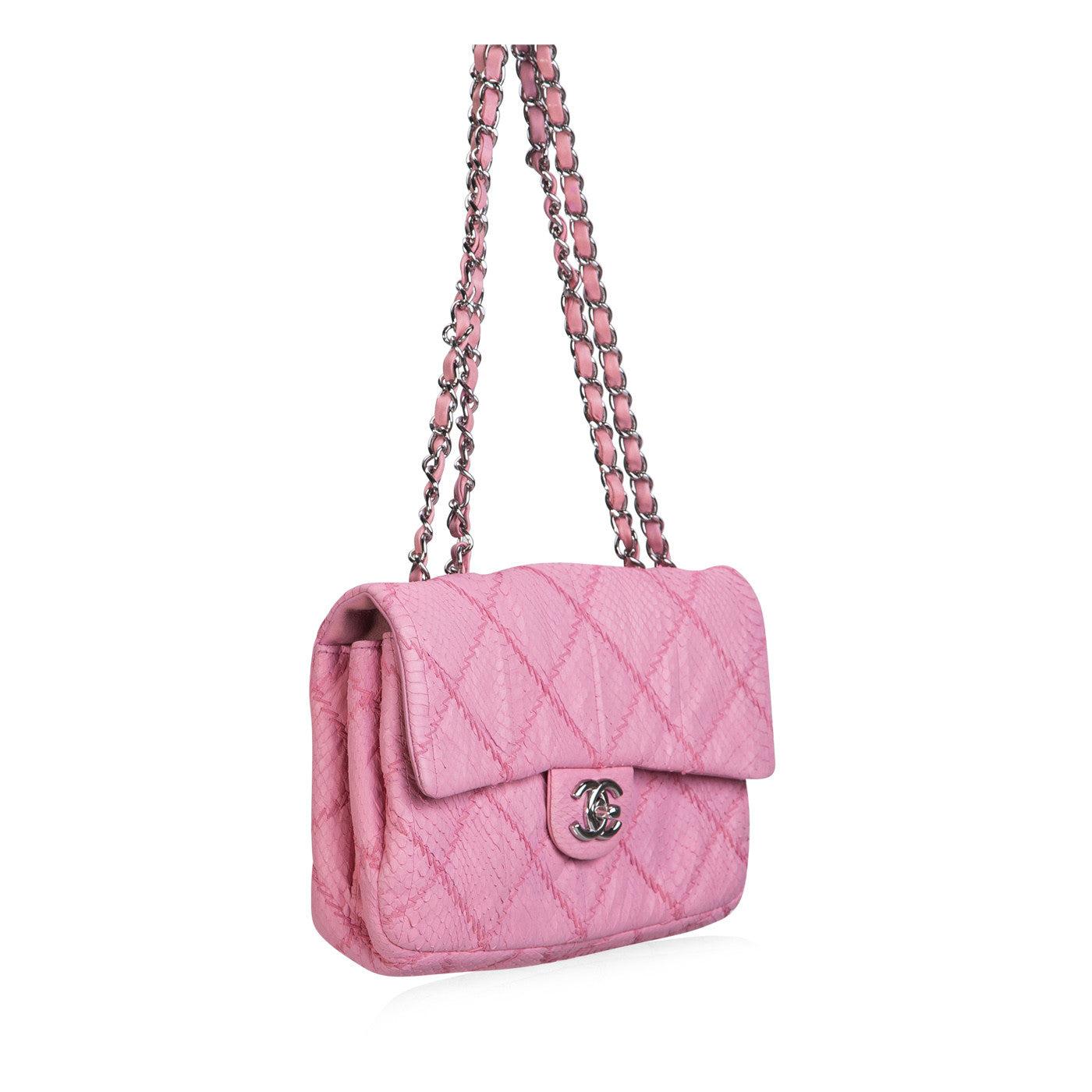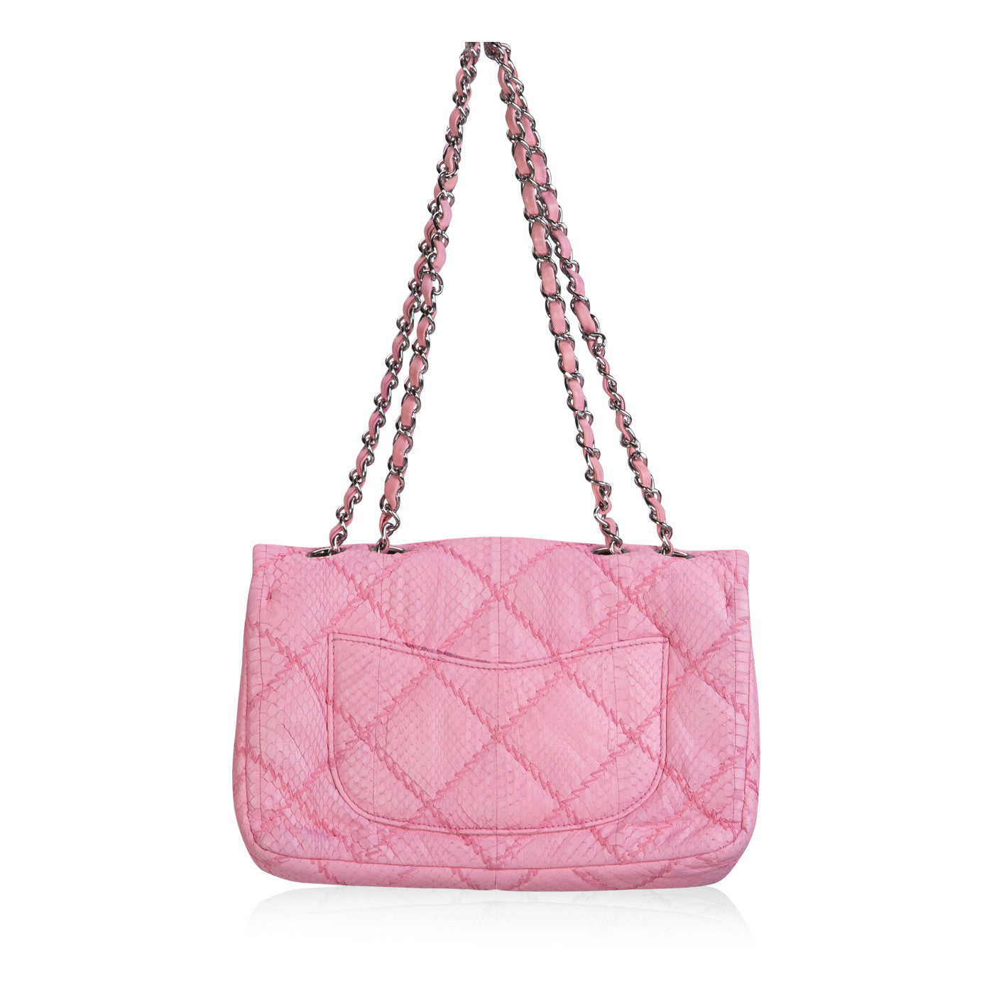Make an impression with this Chanel python bag featuring iconic chain strap and silver tone hardware. A must have timeless piece for any wardrobe!