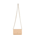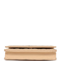 This Wallet on Chain is in light beige caviar with gold tone hardware and has a front flap with CC emblem, half moon back pocket, and a gold tone metal and beige leather interwoven chain.