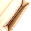 The interior is lined in light beige grossgrain leather and fabric and features a top zipper pocket under flap, a slit front pocket, a zipper compartment with leather pull, and an open pocket with six credit card slots.