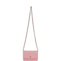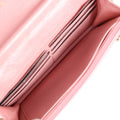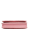 This Wallet on Chain is in Pink Iridescent Caviar with gold hardware, signature half moon exterior back pocket, tonal chain-link crossbody strap/shoulder strap, and front CC gold tone button closure.