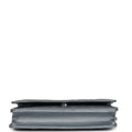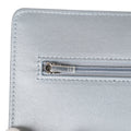 The interior is lined in silver leather and fabric and features a top zipper pocket under flap, a slit front pocket, a zipper compartment with leather pull, and an open pocket with six credit card slots.