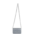 This Wallet on Chain is of silver metallic lambskin with silver tone hardware and has a front flap with CC emblem, half moon back pocket and long silver tone metal and silver leather chain.