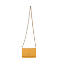This Wallet on Chain is in Yellow Caviar with gold tone hardware, has a front flap with CC emblem, half moon back pocket, and a gold tone metal and yellow leather interwoven chain.