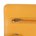 The interior is lined in yellow leather and fabric and features a top zipper pocket under flap, a slit front pocket, a zipper compartment with leather pull, and an open pocket with six credit card slots.