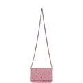 This Chanel classic wallet on chain in pink multicolored tweed fabric with gold tone hardware, tonal stitching, front flap, CC snap lock closure, half moon back pocket, and gold tone chain and pink leather interwoven shoulder/crossbody strap.