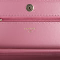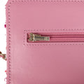 The interior is lined with pink grossgrain leather fabric and features a top zipper pocket under flap, a slit front pocket, a zipper compartment with leather pull, and an open pocket with six credit card slots.