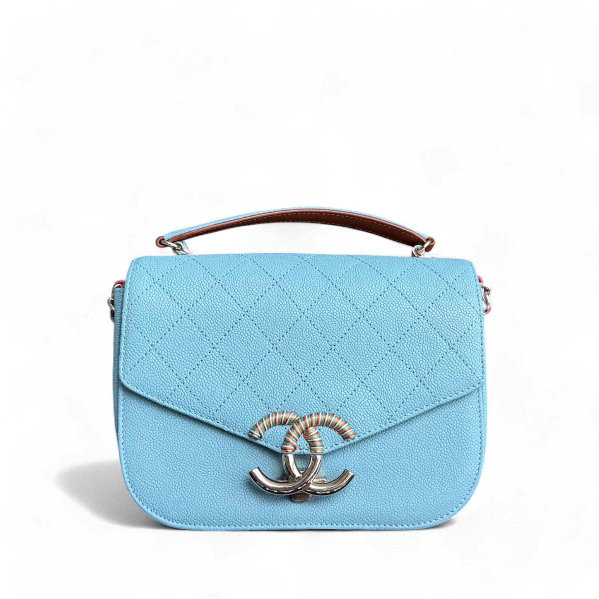 Chanel Coco Curve Cuba in a stunning light blue, a rare gem for any collection. The medium-sized, caviar leather quilted shoulder bag combines elegance with a touch of whimsy. Perfectly crafted, its unique color and design make it a standout piece. Elevate your style with this luxurious accessory.