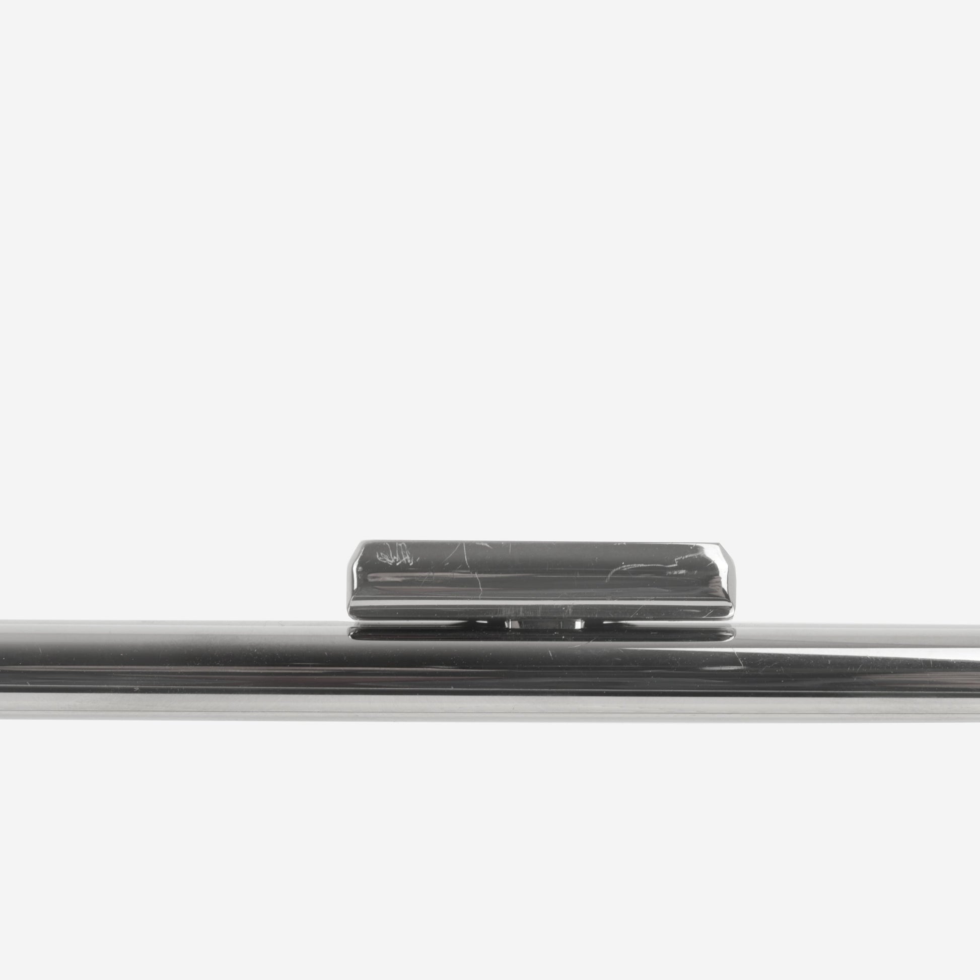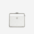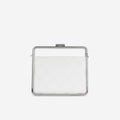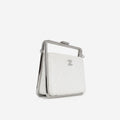 Its versatile design allows it to be styled as a clutch for formal occasions or worn as a satchel with the optional strap for a more relaxed, fashion-forward look. The crisp white leather contrasts beautifully with the cool silver hardware, making it an effortlessly chic choice year-round.
