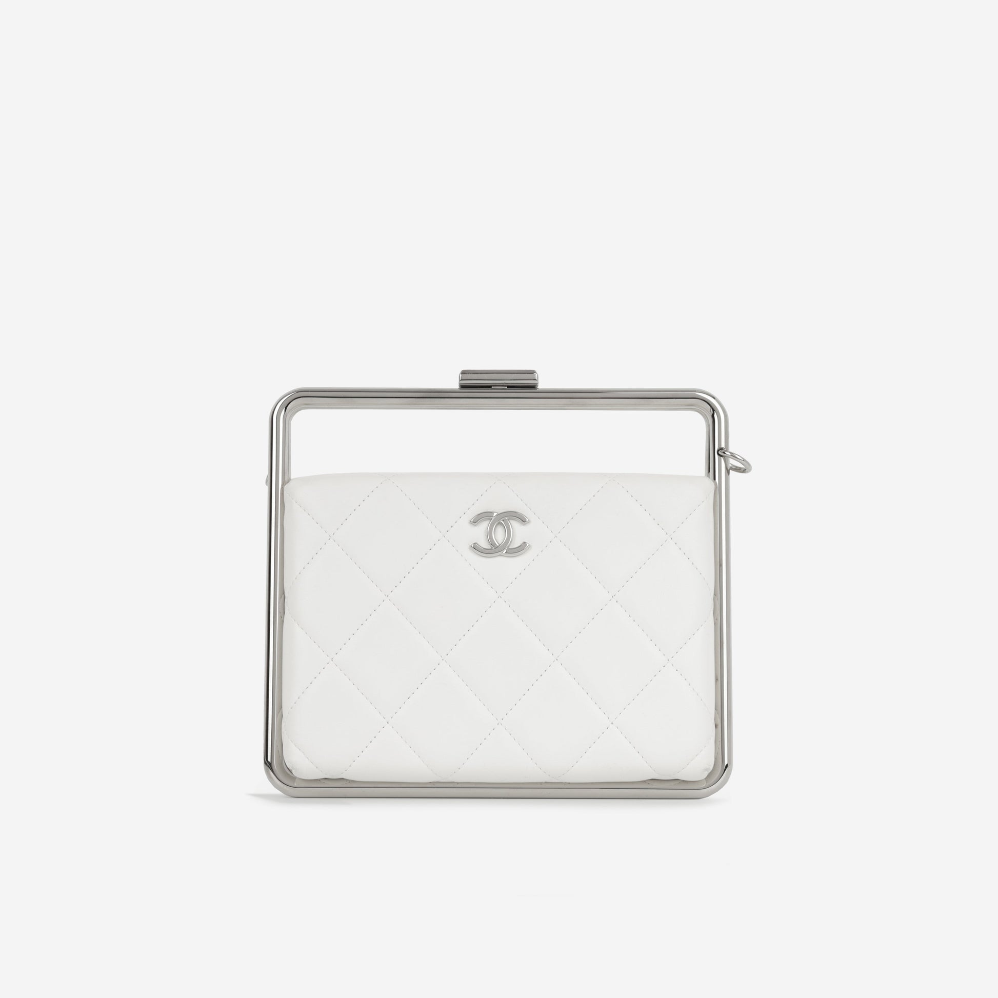 Crafted from soft, luxurious lambskin in classic Chanel diamond quilting, this bag features a structured silver-tone frame that adds architectural flair. The front is adorned with the iconic interlocking CC logo, while the unique frame closure opens to reveal a refined interior. Perfect for your evening essentials.